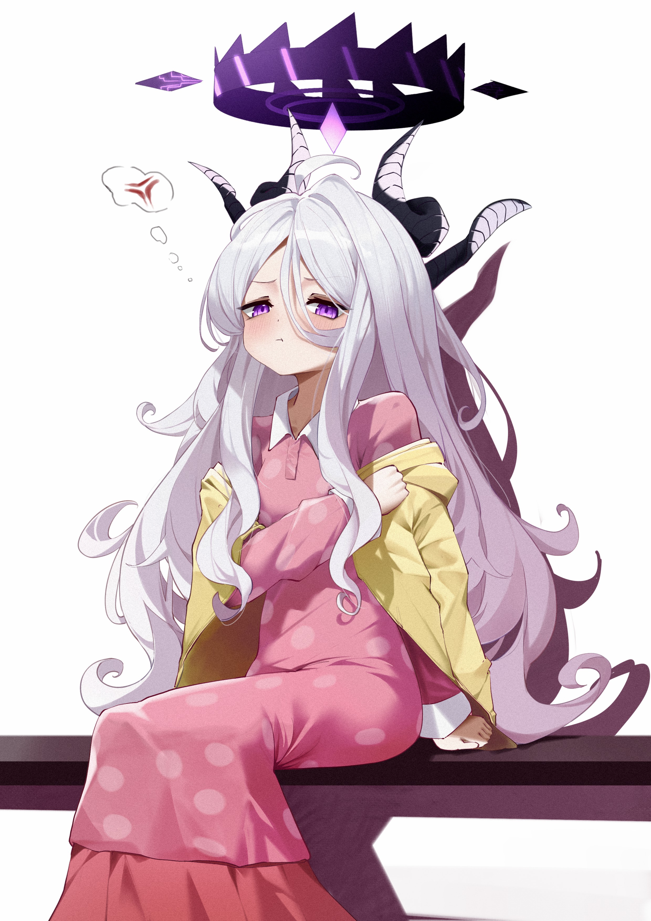 1girl :t absurdres anger_vein bench black_halo blue_archive cardigan commentary_request cowboy_shot demon_girl demon_horns dress hair_between_eyes halo highres hina_(blue_archive) hina_(pajamas)_(blue_archive) horns long_hair long_sleeves looking_at_viewer maoyu_(furfish) multicolored_halo official_alternate_costume official_alternate_hairstyle on_bench open_cardigan open_clothes pajamas park_bench pink_dress pink_pajamas polka_dot polka_dot_pajamas pout purple_eyes sidelocks simple_background sitting solo speech_bubble spoken_anger_vein thought_bubble two-tone_halo wavy_hair white_background white_hair yellow_cardigan