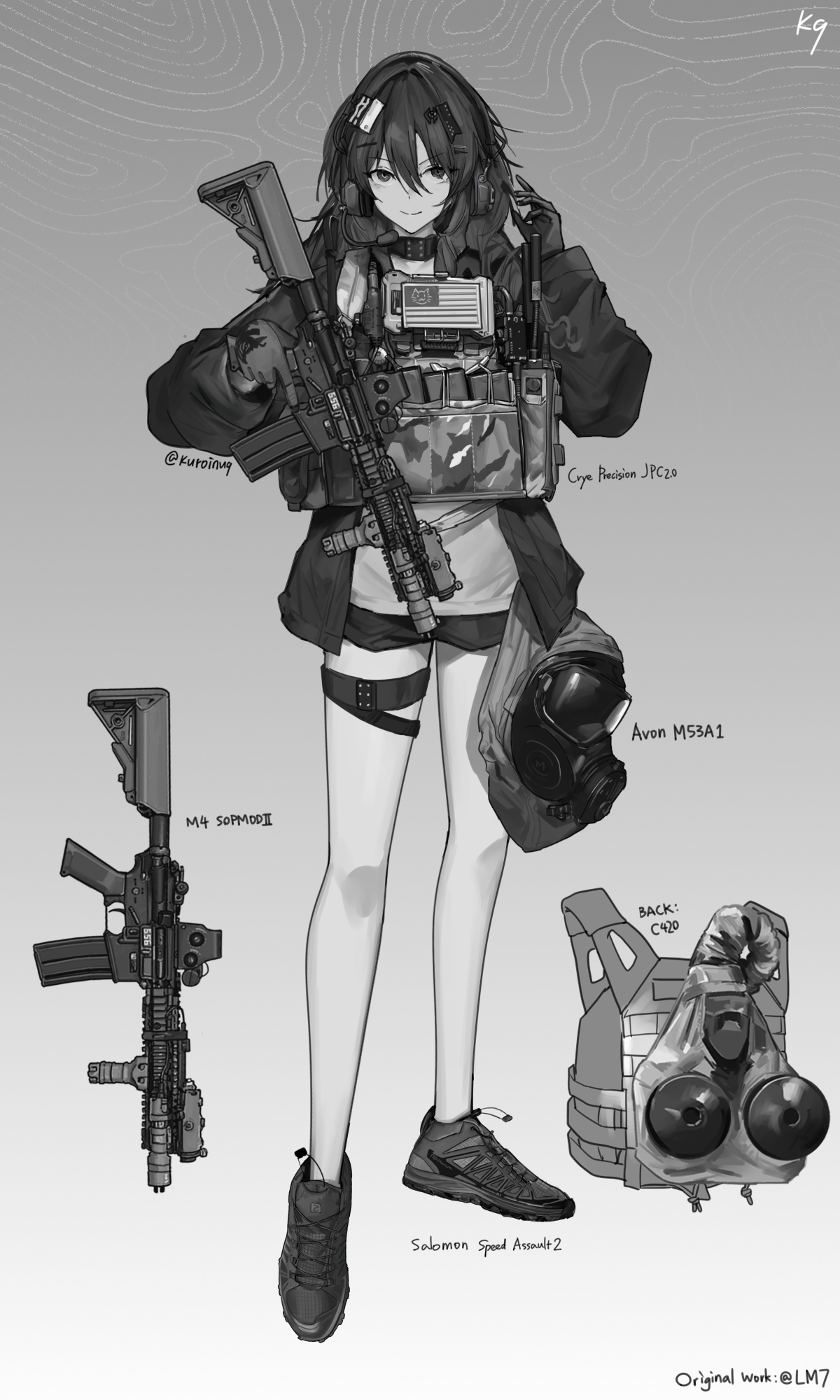 1girl assault_rifle bare_legs black_hair bulletproof_vest choker commentary_request gun highres kuroinu9 lavender_quartz magazine_(weapon) military_combat_uniform military_uniform monochrome rifle short_hair tactical_clothes weapon