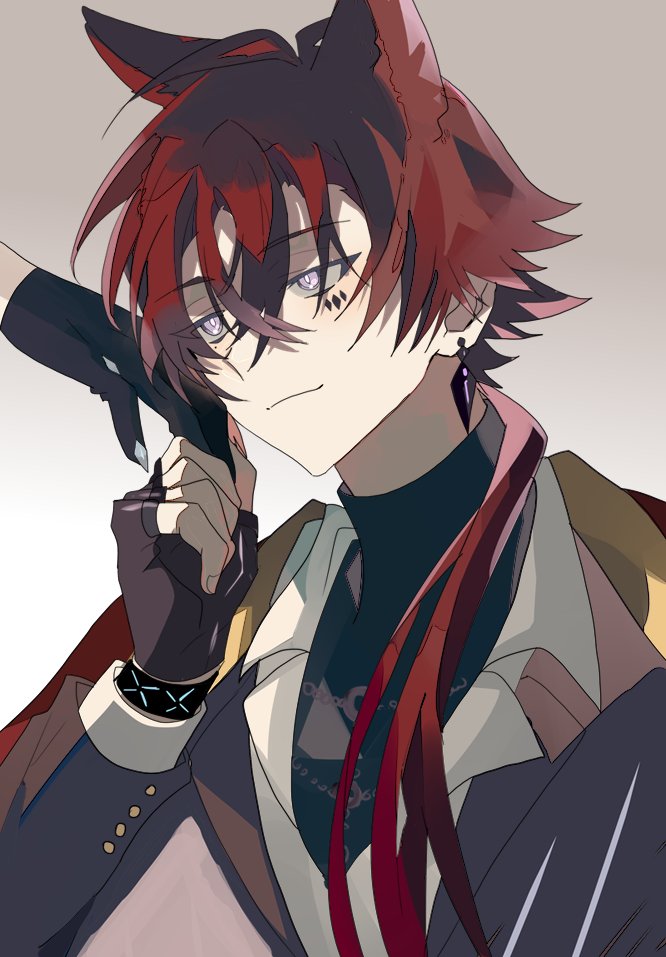 1boy animal_ears arknights bellone_(arknights) cape earrings facial_mark formal_clothes gloves holding_hands jewelry male_focus ptptprpr purple_eyes red_hair short_hair simple_background suit upper_body wolf_ears