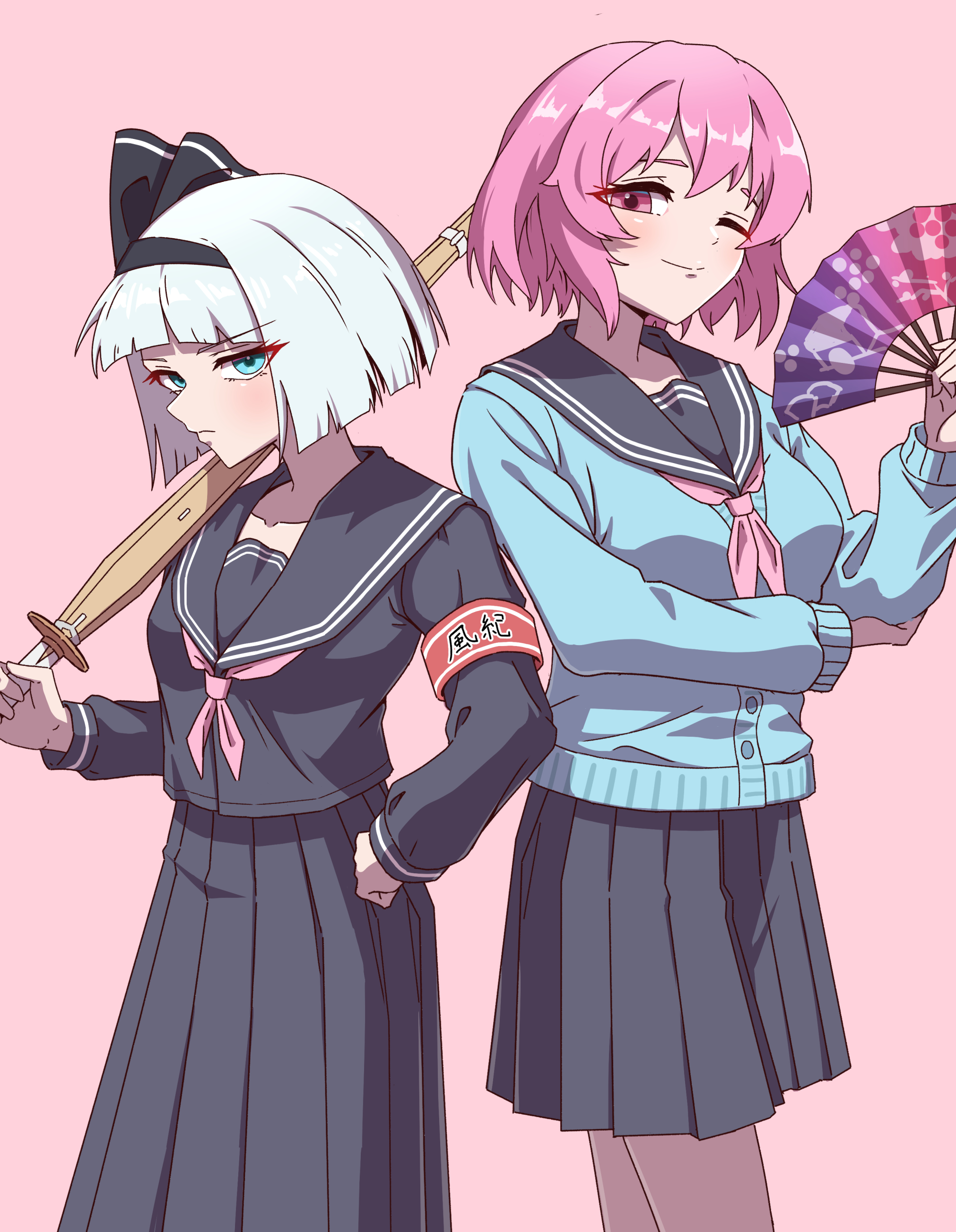 2girls absurdres armband black_hairband black_sailor_collar black_shirt black_skirt blue_cardigan blue_eyes cardigan closed_mouth commentary_request contemporary folding_fan grey_hair hairband hand_fan highres holding holding_fan holding_sword holding_weapon konpaku_youmu long_skirt long_sleeves looking_at_viewer missing_headwear multiple_girls neckerchief one_eye_closed pink_background pink_eyes pink_hair pink_neckerchief pleated_skirt red_armband saigyouji_yuyuko sailor_collar school_uniform serafuku shinai shirt simple_background skirt smile sword tamahuku_0911 touhou translation_request weapon