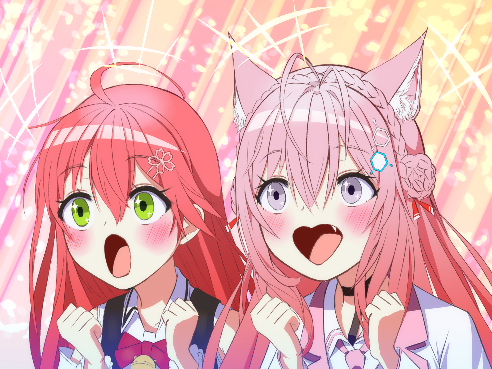 2girls ahoge animal_ear_fluff animal_ears antenna_hair blush collared_shirt commentary_request fang green_eyes hakui_koyori hakui_koyori_(1st_costume) highres hololive long_hair looking_at_viewer multiple_girls necktie official_alternate_costume open_mouth pink_hair pink_necktie purple_eyes sakura_miko sakura_miko_(casual) shirt very_long_hair virtual_youtuber white_shirt wolf_ears wolf_girl yaki_no_yaki