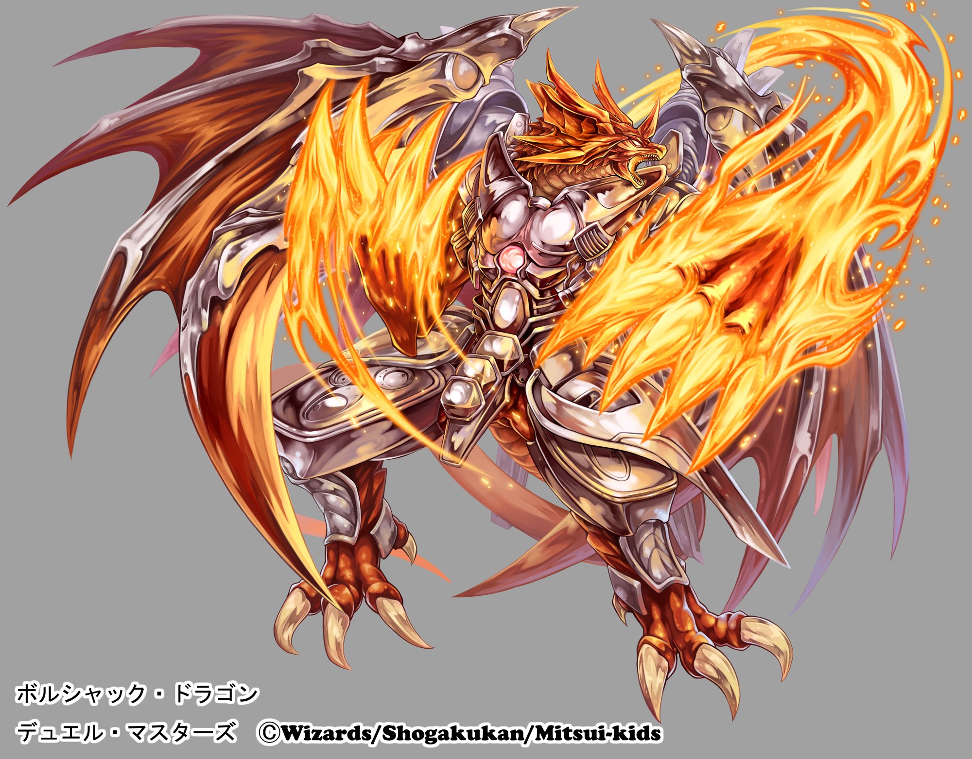 armor bolshack_dragon claws commentary_request copyright_notice dragon_tail dragon_wings duel_masters fire grey_background highres no_humans official_art open_mouth sharp_teeth silver_armor solo tail teeth tumikaze white_eyes wings