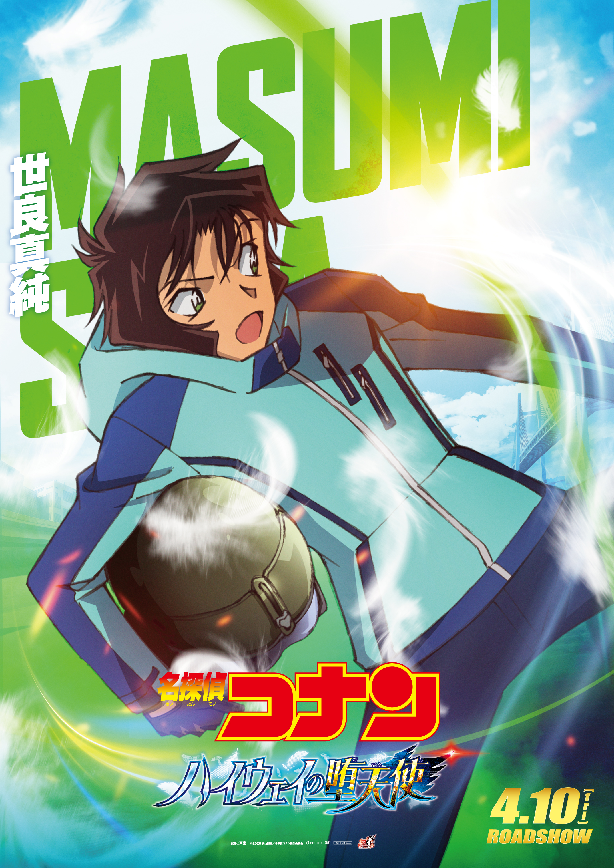 1girl absurdres anime_coloring black_hair blue_eyes blue_gloves blue_track_suit bridge character_name commentary_request copyright_logo copyright_notice cowboy_shot facing_away falling_feathers feathers gloves green_theme helmet highres holding holding_unworn_helmet jacket kicking logo long_sleeves looking_to_the_side meitantei_conan official_art open_mouth outdoors pants sera_masumi short_hair sky solo track_jacket track_pants track_suit unworn_headwear unworn_helmet white_feathers