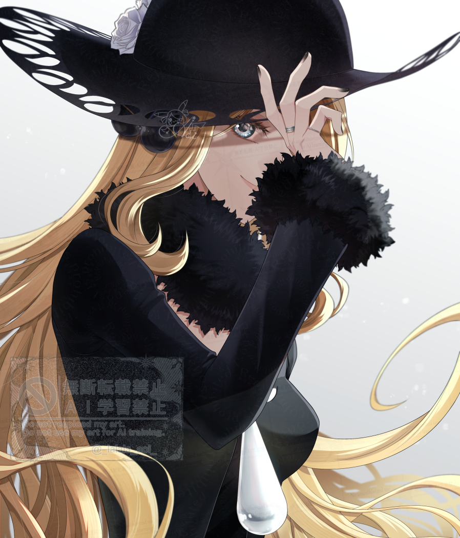 1girl black_hat black_nails blonde_hair breasts closed_mouth cogita_(pokemon) cogita_(pokemon)_(cosplay) cosplay cynthia_(pokemon) fur-trimmed_sleeves fur_collar fur_trim grey_background grey_eyes hand_up hat jewelry long_hair nintendo pokemon pokemon_diamond/pearl/platinum pokemon_legends:_arceus ring sakaralalala simple_background smile solo sun_hat upper_body very_long_hair watermark wavy_hair