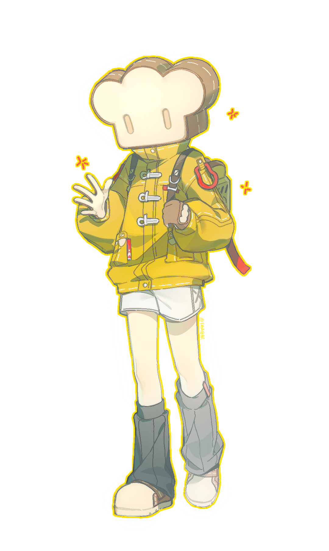 1boy backpack bag bread bread_slice chinese_commentary commentary_request fingerless_gloves food full_body gloves highres honkai:_nexus_anima honkai_(series) jacket long_sleeves shade shorts simple_background solo standing w0844 white_background white_shorts yellow_jacket