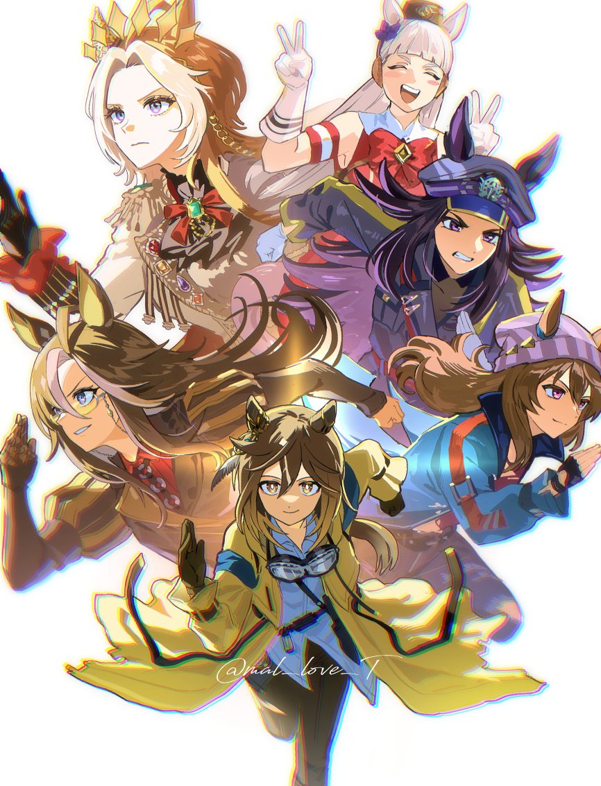 6+girls ahoge animal_ears armband ascot asymmetrical_shirt beanie black_ascot black_gloves black_hair black_jacket black_pants black_shirt blue_coat blue_eyes blunt_bangs blush bow breasts brown_eyes brown_hair brown_hat clenched_teeth closed_mouth coat denim double_v dream_journey_(reminder_of_dreamland)_(umamusume) dream_journey_(umamusume) dress ear_bow ear_covers ears_through_headwear eyewear_strap fenomeno_(black_flames_of_the_righteous_spirit)_(umamusume) fenomeno_(umamusume) fingerless_gloves flipped_hair gem glasses gloves goggles goggles_around_neck gold_ship_(red_strife)_(umamusume) gold_ship_(umamusume) green_gem grey_hair grey_hat hair_between_eyes hat horse_ears horse_girl horse_tail horseshoe_hat_ornament horseshoe_ornament jacket jeans knife_sheath long_hair long_sleeves mogyus multicolored_hair multiple_girls nakayama_festa_(shichuukyuukatsu)_(umamusume) nakayama_festa_(umamusume) open_mouth orange_hair orfevre_(control)_(umamusume) orfevre_(umamusume) pants peaked_cap pillbox_hat purple_eyes purple_hair red_dress running sheath shirt single_ear_cover sleeveless sleeveless_dress smile stay_gold_(sunlit_outsider)_(umamusume) stay_gold_(umamusume) stay_gold_clan_(umamusume) striped_armband striped_clothes striped_hat tail teeth torn_clothes torn_coat torn_jeans torn_pants torn_shirt two-tone_hair umamusume v white_coat white_gloves white_hair white_shirt wrist_belt yellow_coat