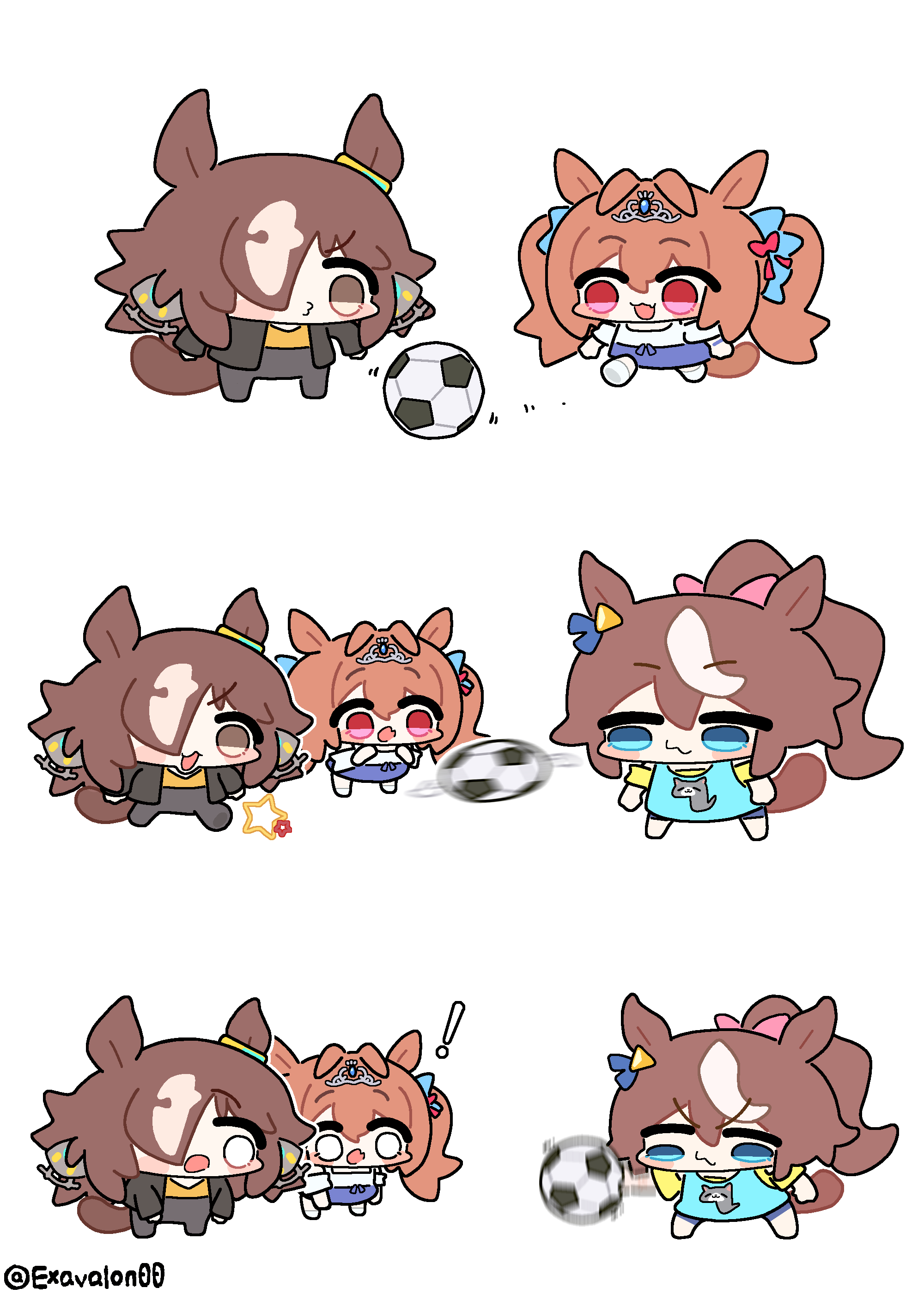 ! 3girls :3 absurdres animal_ears ball blue_eyes bow brown_eyes brown_hair chibi chibi_only commentary daiwa_scarlet_(umamusume) ear_ribbon earrings full_body highres horse_ears horse_girl horse_tail jewelry kicking multicolored_hair multiple_girls red_eyes sima_(startwitch) single_earring soccer soccer_ball star_(symbol) tail tiara tokai_teio_(umamusume) twitter_username umamusume untranslatable_commentary vodka_(umamusume) white_background