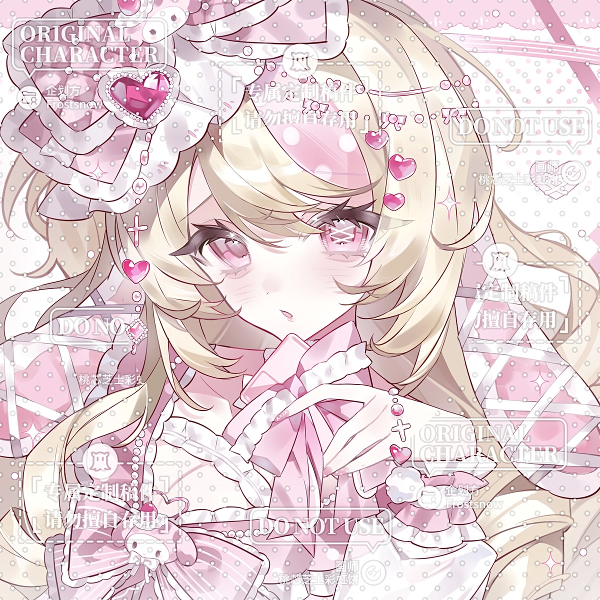 1girl animal_ears blonde_hair blush bow bowtie breasts cleavage dress eyelashes frills hair_bow hair_ornament heart heart_hair_ornament highres jewelry long_hair looking_at_viewer open_mouth original pink_bow pink_eyes pink_nails pink_ribbon pink_theme puffy_short_sleeves puffy_sleeves rabbit_ears ribbon sample_watermark short_sleeves solo taoxingzhishi too_many_watermarks upper_body watermark