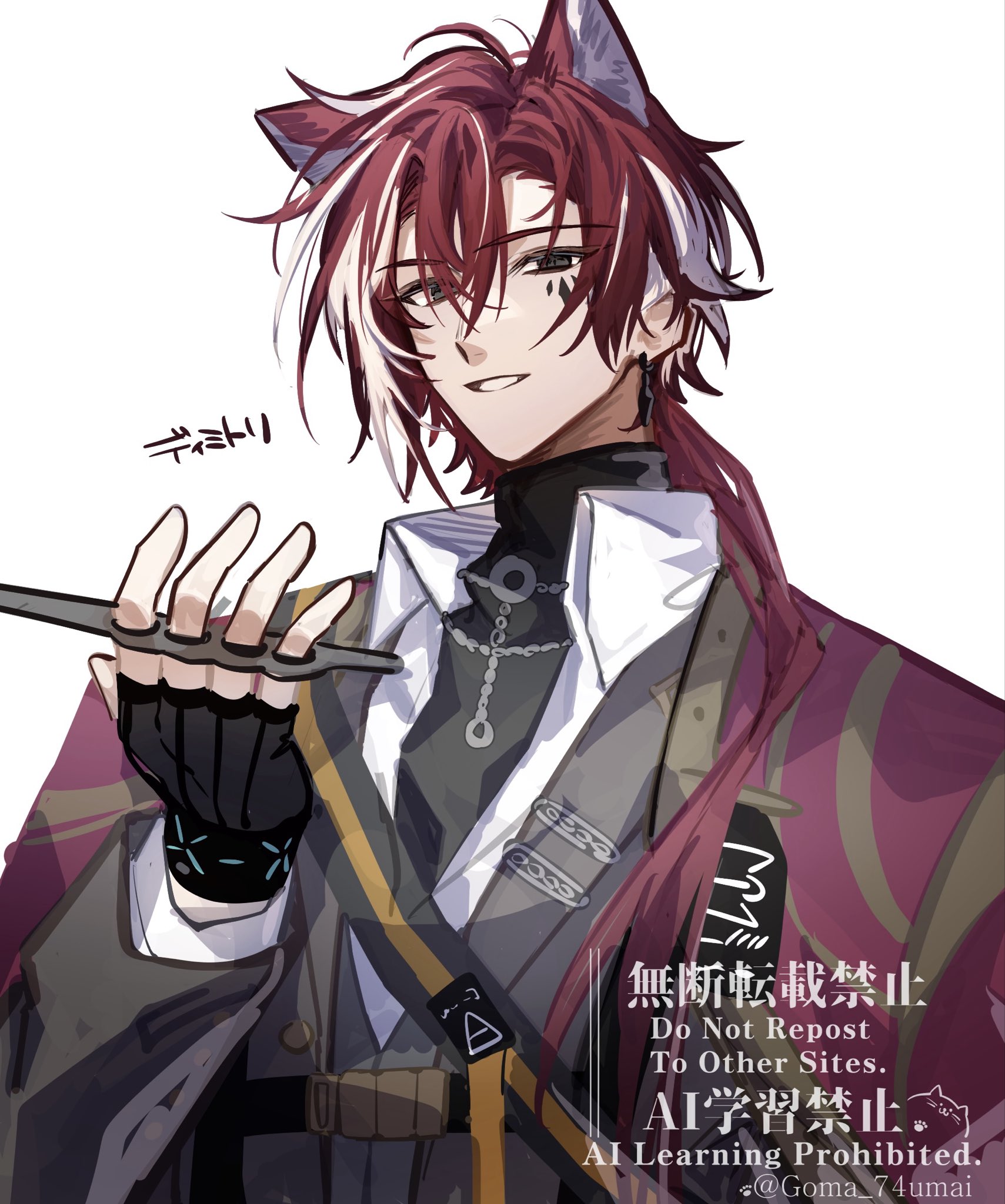 &{ID:13704947 CreatedAt:Sun Mar 22 09:15:41 -0500 2026 Score:0 Width:1709 Height:2048 MD5:c49989c2826f8e2275021b3d7cef3666 Directory:c4/99 Image:c49989c2826f8e2275021b3d7cef3666.jpg Rating:general Source:https://x.com/Goma_74umai/status/2035609024490827997 Change:1774188941 Owner:danbooru CreatorID:6498 ParentID:0 Sample:1 PreviewHeight:350 PreviewWidth:292 Tags:1boy animal_ears arknights bellone_(arknights) cat_ears coat commentary_request earrings facial_mark fingerless_gloves gloves gomago_magoma green_eyes hair_between_eyes highres holding holding_knife jacket jewelry knife long_hair male_focus multicolored_hair necklace red_hair simple_background streaked_hair turtleneck upper_body Title: HasNotes:false HasComments:false FileURL:https://img2.gelbooru.com/images/c4/99/c49989c2826f8e2275021b3d7cef3666.jpg PreviewURL:https://gelbooru.com/thumbnails/c4/99/thumbnail_c49989c2826f8e2275021b3d7cef3666.jpg SampleURL:https://img2.gelbooru.com/samples/c4/99/sample_c49989c2826f8e2275021b3d7cef3666.jpg SampleHeight:1019 SampleWidth:850 Status:active PostLocked:0 HasChildren:false IsVideo:false DisplayDate:22.03.2026 09:15}