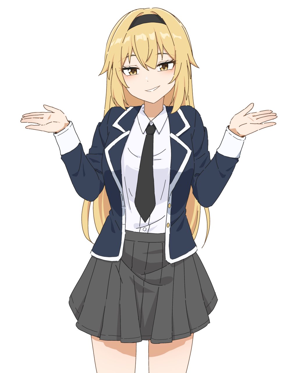1girl asiri_senpai black_hairband black_necktie blonde_hair blue_jacket breasts change_ring_(series) collared_shirt commentary commission cowboy_shot double-parted_bangs english_commentary grey_shirt hair_between_eyes hairband hands_up highres jacket long_hair long_sleeves looking_at_viewer medium_breasts miho_hasegawa_(change_ring) miniskirt necktie open_clothes open_jacket parted_lips pleated_skirt school_uniform second-party_source shirt skirt smile smug solo straight-on straight_hair white_shirt white_trim white_wrist_cuffs wing_collar wrist_cuffs yellow_eyes