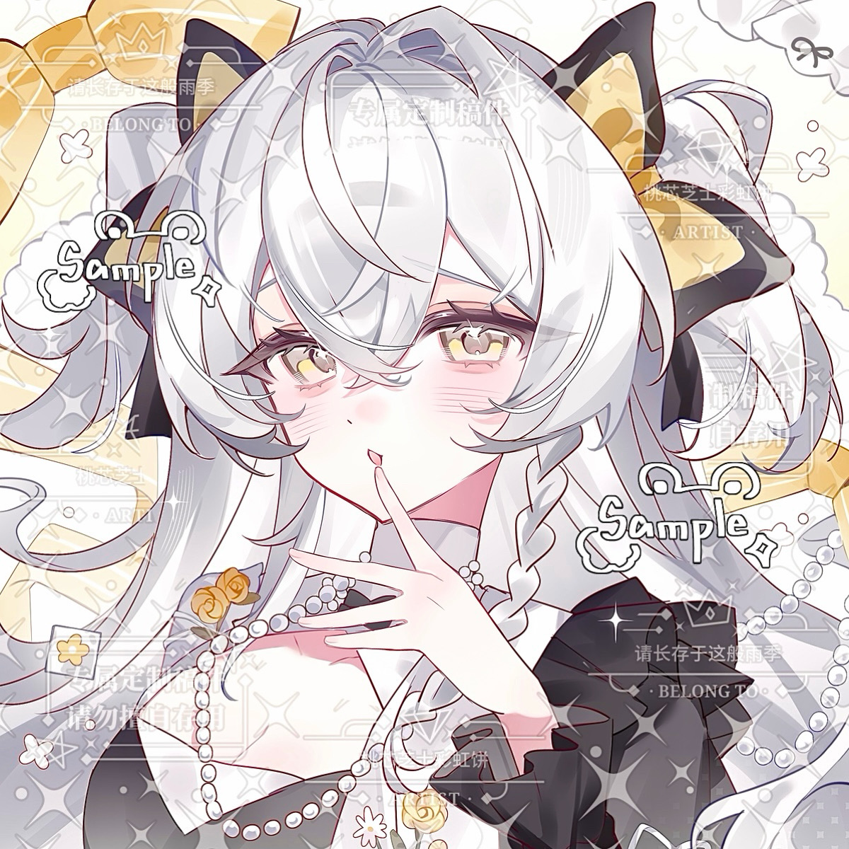 1girl bead_necklace beads black_bow black_dress black_sleeves blush bow braid breasts chinese_commentary cleavage cleavage_cutout clothing_cutout commentary_request crossed_bangs dress eyelashes finger_to_mouth flower frilled_sleeves frills hair_bow highres jewelry long_hair long_sleeves looking_at_viewer necklace open_mouth original parted_lips pearl_necklace puffy_sleeves rose sample_watermark shirt side_braid single_braid solo sparkle taoxingzhishi two_side_up upper_body watermark white_background white_hair yellow_bow yellow_eyes yellow_flower yellow_rose