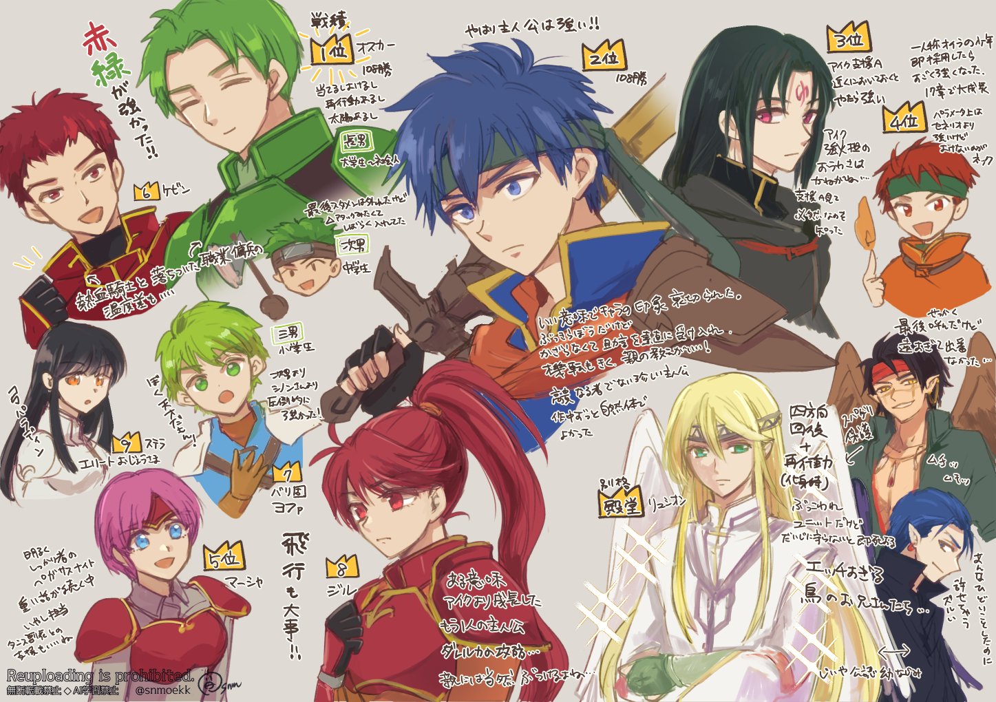 3girls 6+boys armor astrid_(fire_emblem) black_hair blonde_hair blue_eyes blue_hair boyd_(fire_emblem) closed_eyes closed_mouth commentary_request ear_chain facial_mark fire_emblem fire_emblem:_path_of_radiance forehead_mark green_eyes green_hair green_headband headband ike_(fire_emblem) jill_(fire_emblem) kieran_(fire_emblem) linked_piercing long_hair male_focus marcia_(fire_emblem) multiple_boys multiple_girls naesala_(fire_emblem) nintendo open_mouth oscar_(fire_emblem) piercing pink_hair pointy_ears ponytail red_eyes red_hair reyson_(fire_emblem) rolf_(fire_emblem) sanami short_hair soren_(fire_emblem) tibarn_(fire_emblem) tormod_(fire_emblem) translation_request twitter_username wings