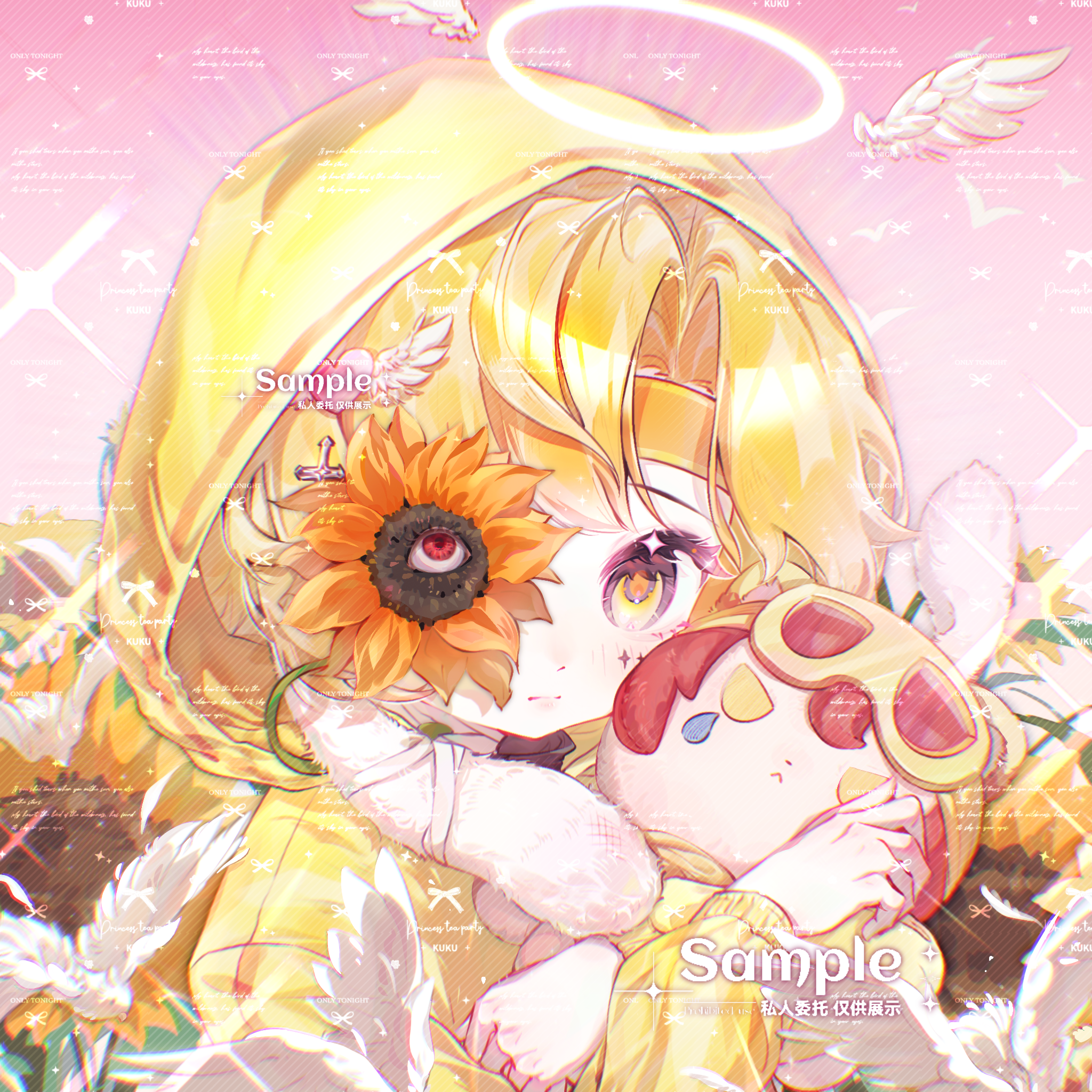 1boy angel angel_wings blonde_hair closed_mouth flower haitaixiaoshu halo highres holding holding_stuffed_toy hood hood_up hoodie hugging_object long_sleeves looking_at_viewer male_focus one_eye_covered original solo stuffed_animal stuffed_toy sunflower too_many_watermarks watermark wings yellow_eyes