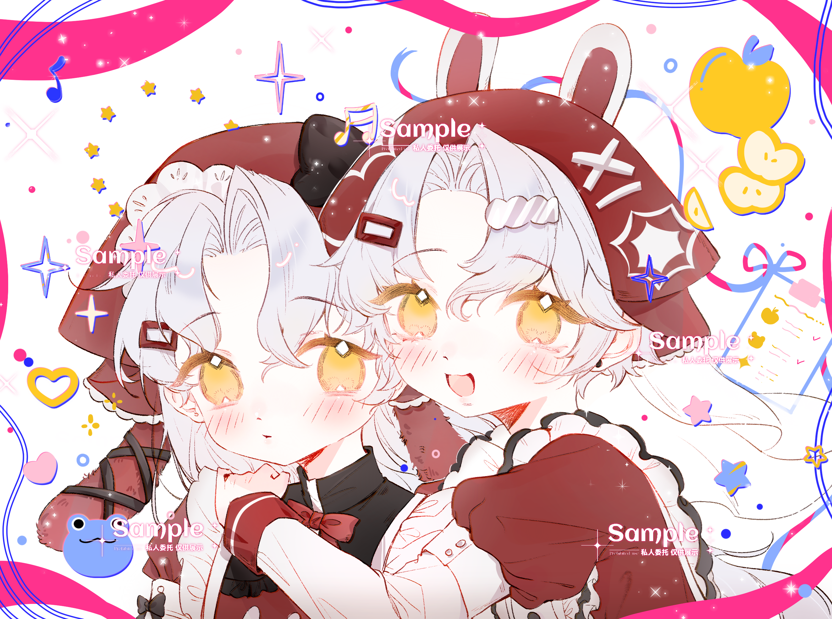2boys animal_ears blush bow crossdressing flat_color grey_hair hair_ornament hairclip haitaixiaoshu hat highres hug long_sleeves looking_at_viewer male_focus multiple_boys open_mouth original portrait rabbit_ears rabbit_hair_ornament short_hair smile white_hair yellow_eyes