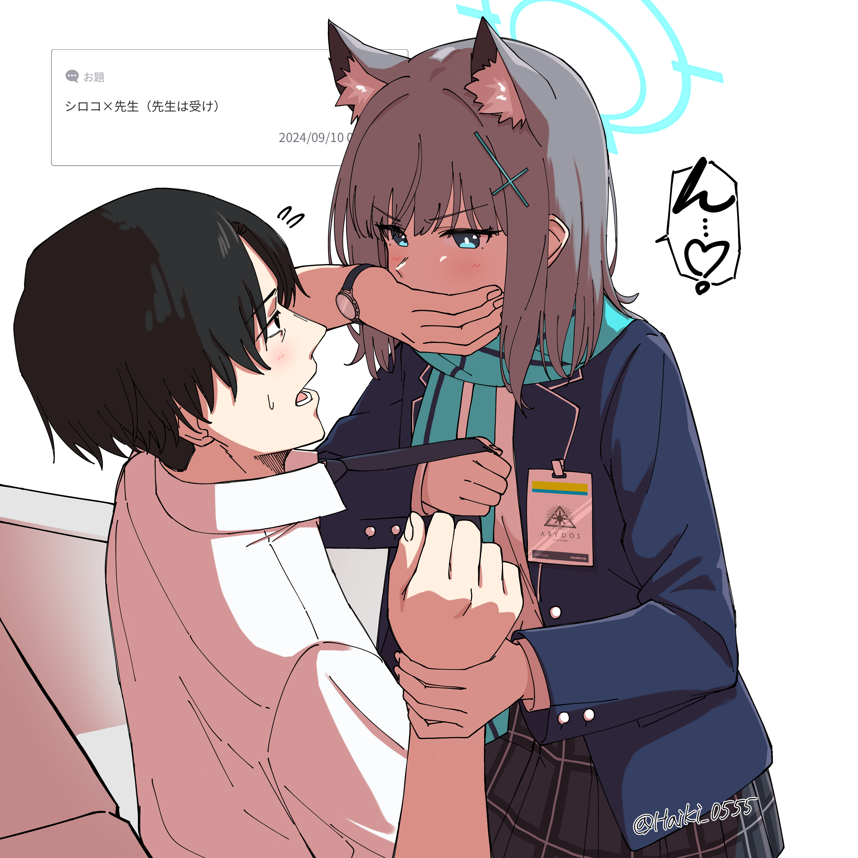 1boy 1girl absurdres abydos_high_school_logo animal_ears blue_archive blue_eyes blue_halo commentary_request grey_hair haiki_(haikiman) halo highres looking_at_another scarf sensei_(blue_archive) shiroko_(blue_archive) short_hair wolf_ears