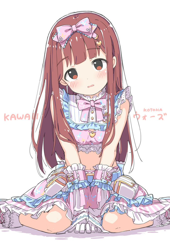 1girl blunt_bangs blush bow bowtie brown_eyes brown_hair character_name crop_top cropped_shirt dot_nose frilled_skirt frills full_body gloves hair_bow idolmaster idolmaster_million_live! idolmaster_starlit_season kuresuku_(lessons) long_hair looking_at_viewer midriff navel open_mouth pink_bow pink_bowtie pink_shirt pink_skirt shirt simple_background sitting skirt sleeveless sleeveless_shirt socks solo sweet_dolls_(idolmaster) tanaka_kotoha wariza white_background white_gloves white_socks