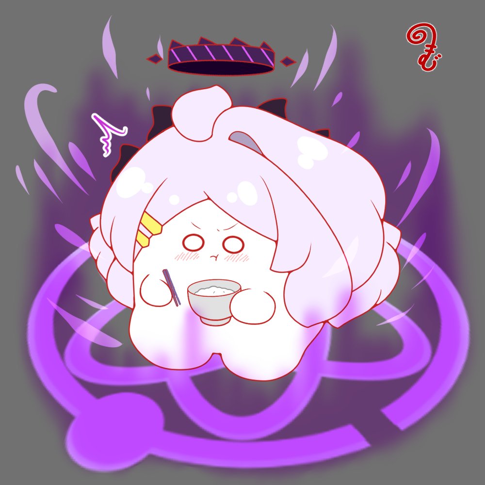:t ^^^ ahoge blue_archive blush bowl chopsticks closed_mouth commentary_request grey_background grey_hair hair_ornament hairclip halo hina_(blue_archive) holding holding_bowl holding_chopsticks horns kurukurumagical parted_bangs rice rice_bowl single_hair_intake solo v-shaped_eyebrows wide_oval_eyes