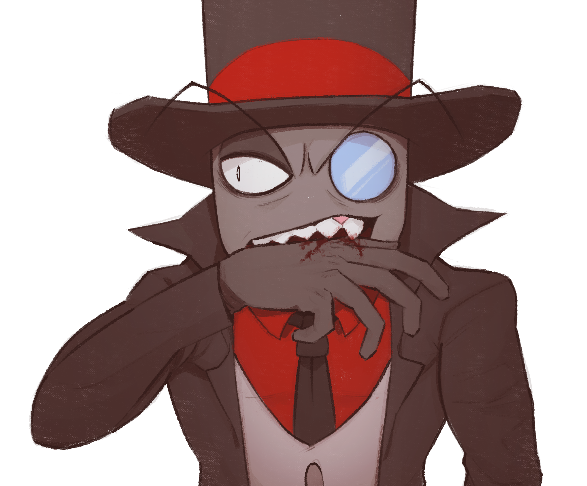1boy black_coat black_hat black_hat_(villainous) black_necktie blood blood_on_hands buttons coat collared_shirt colored_skin commentary_request grey_skin hand_up hat highres looking_to_the_side male_focus monocle necktie netekun open_clothes open_coat open_mouth red_shirt self-harm sharp_teeth shirt simple_background solo teeth top_hat vest villainous white_background white_vest