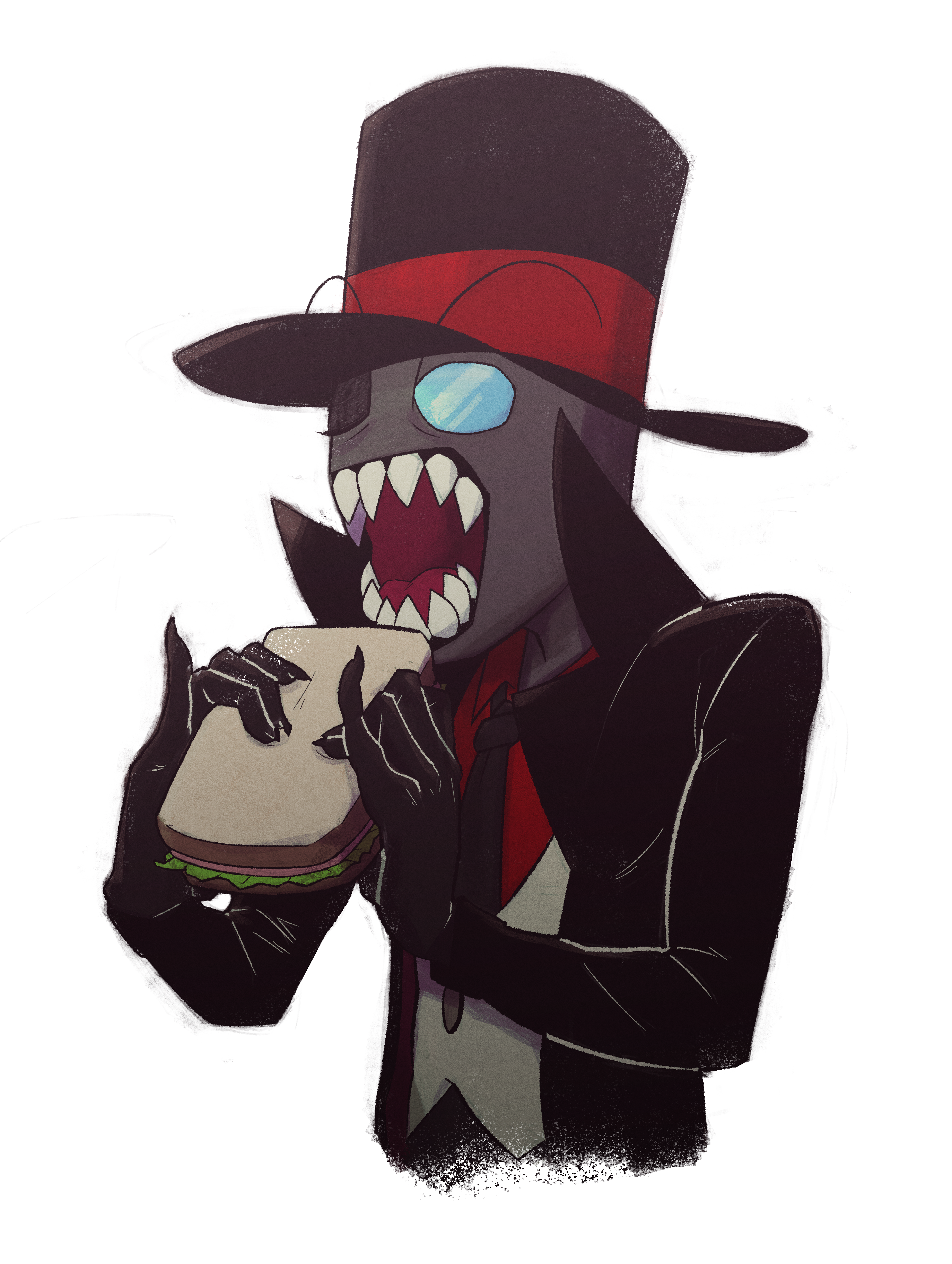 1boy absurdres black_coat black_hat black_hat_(villainous) black_necktie buttons closed_eyes coat collared_shirt colored_skin commentary_request cropped_torso food grey_skin hat highres holding holding_food holding_sandwich male_focus monocle necktie netekun open_clothes open_coat open_mouth red_shirt sandwich sharp_teeth shirt simple_background solo teeth top_hat upper_body vest villainous white_background white_vest