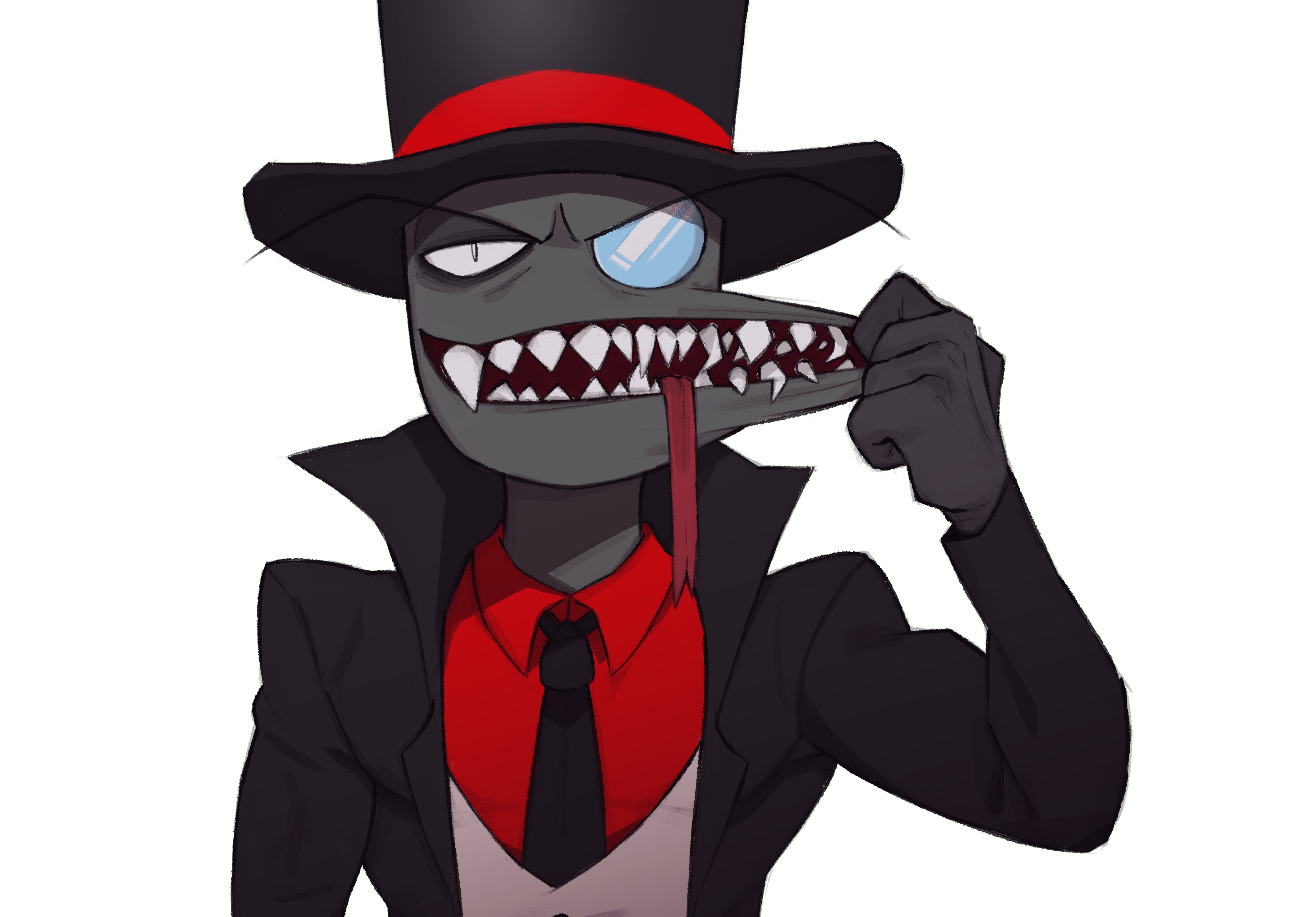 1boy absurdres black_coat black_hat black_hat_(villainous) black_necktie buttons coat collared_shirt colored_skin commentary_request grey_skin hand_up hat highres looking_at_viewer male_focus monocle necktie netekun open_clothes open_coat red_shirt sharp_teeth shirt simple_background solo teeth tongue tongue_out top_hat upper_body villainous white_background
