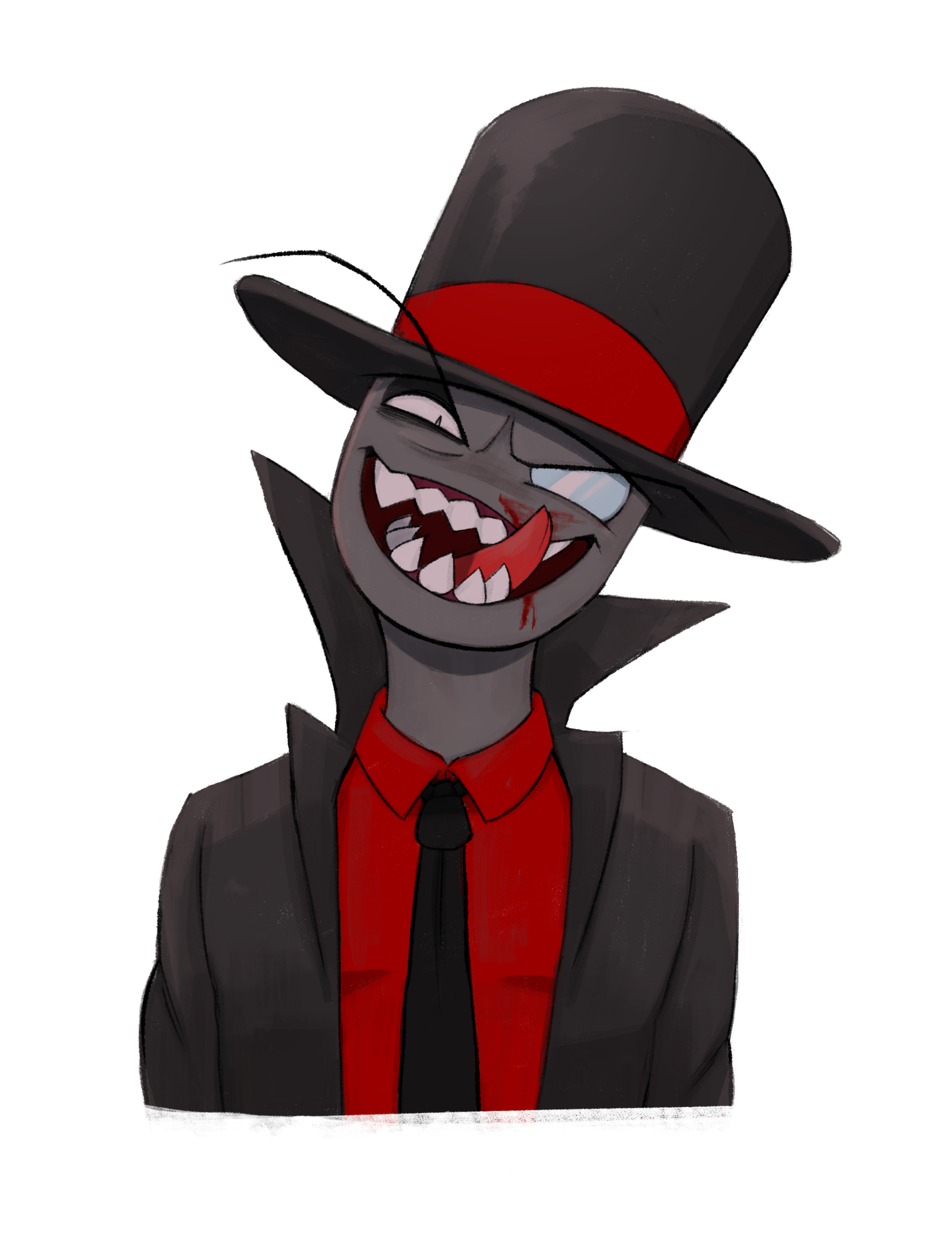 1boy absurdres black_coat black_hat black_hat_(villainous) black_necktie blood coat collared_shirt colored_skin commentary_request grey_skin half-closed_eye hat highres looking_at_viewer male_focus monocle necktie netekun open_clothes open_coat red_shirt sharp_teeth shirt simple_background solo teeth tongue tongue_out top_hat upper_body villainous white_background