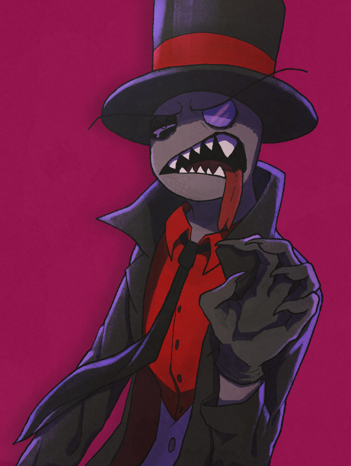 1boy black_coat black_gloves black_hat black_hat_(villainous) black_necktie buttons coat collared_shirt colored_skin commentary_request gloves grey_skin hand_up hat highres male_focus monocle necktie netekun open_clothes open_coat purple_background red_shirt sharp_teeth shirt solo teeth tongue tongue_out top_hat vest villainous