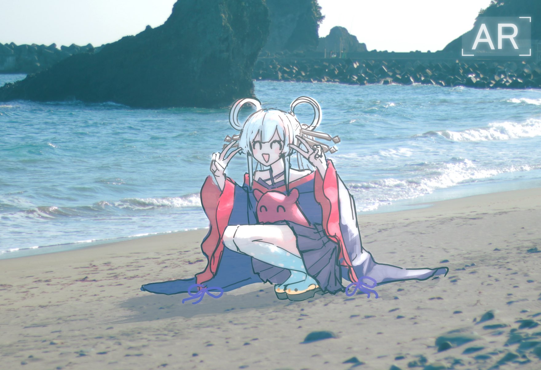 1girl :d ^_^ bare_shoulders beach blue_kimono cho_kaguya-hime! closed_eyes colored_extremities commentary_request criss-cross_halter day double_v dress facing_viewer hair_ornament hair_rings hair_stick halterneck highres insomnia_bak japanese_clothes kimono off_shoulder open_mouth outdoors photo_background pleated_dress purple_dress runami_yachiyo smile solo squatting twintails v white_hair