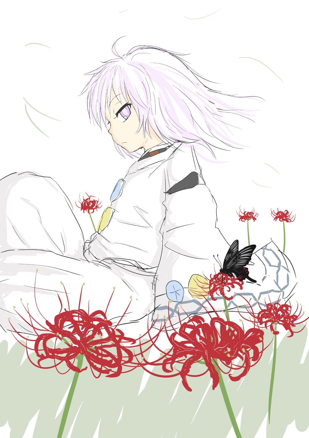 1boy black_butterfly bug butterfly child commentary flower from_side grass hakama hakudoushi highres insect inuyasha ishryuzo japanese_clothes japanese_ranguage_commentary kimono long_hair male_focus purple_eyes red_flower sitting sketch solo spider_lily white_background white_hair white_hakama white_kimono wide_sleeves wind
