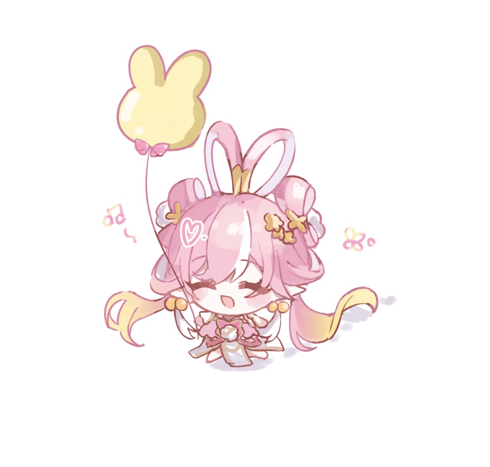 1girl animal_balloon balloon blonde_hair chibi chibi_only chinese_clothes commentary dress elf elysia_(hi_love_elf)_(honkai_impact) elysia_(honkai_impact) elysia_(lunar_grace)_(honkai_impact) feixianji_(hairstyle) hair_rings holding holding_balloon honkai_(series) honkai_impact_3rd long_hair official_alternate_costume pink_dress pink_hair pointy_ears rabbit_balloon simple_background smile solo tdatnst untranslatable_commentary very_long_hair white_background