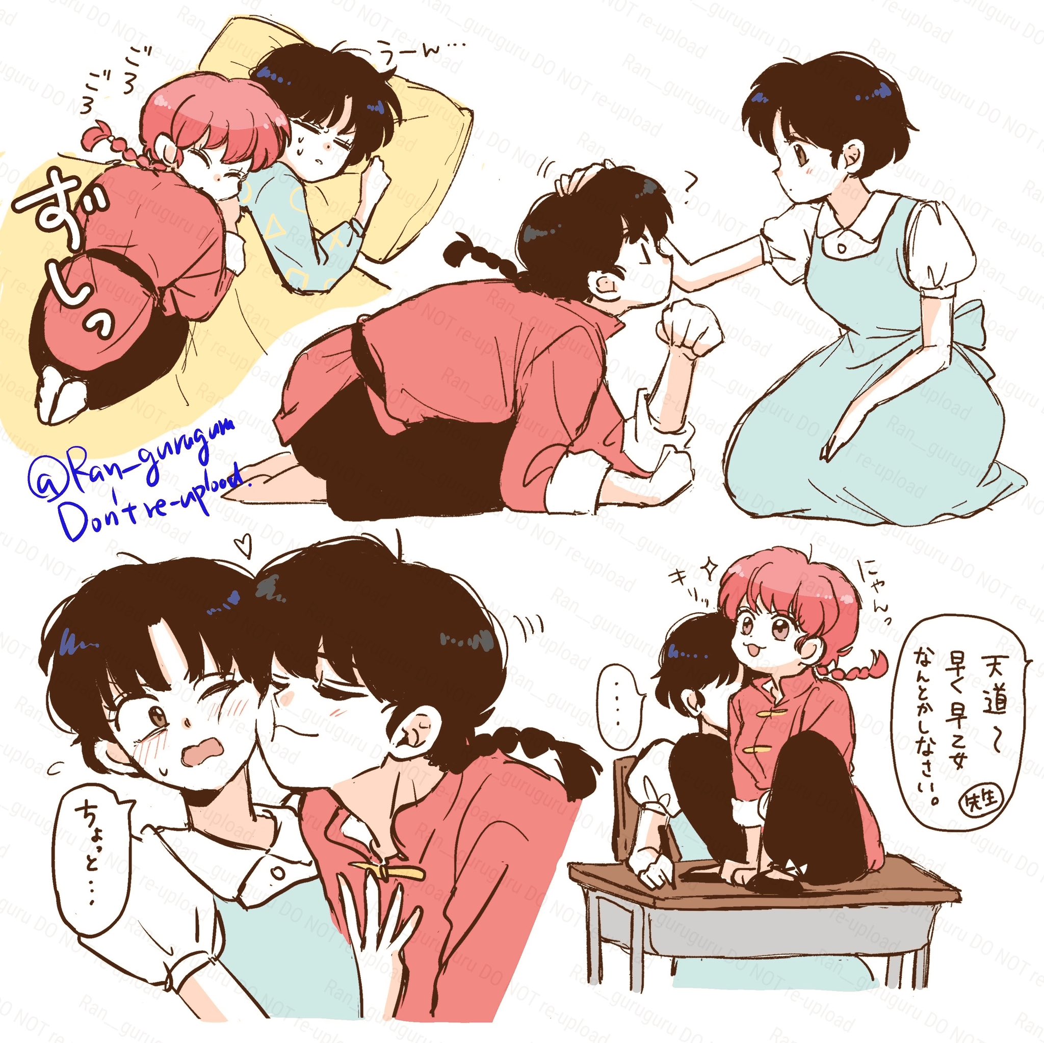 ... 1boy 2girls barefoot bisexual_female black_hair black_pants black_shoes blue_dress blush braid brown_eyes chinese_clothes closed_eyes desk dress fuurinkan_high_school_uniform hand_on_another's_chest highres lying_on_person multiple_girls nekoken_technique nuzzle on_desk pants petting pink_hair ranma-chan ranma_1/2 saotome_ranma school_uniform shoes short_hair single_braid sitting spoken_ellipsis tendou_akane too_many_watermarks tori_(runrunpiia) translation_request under_covers watermark