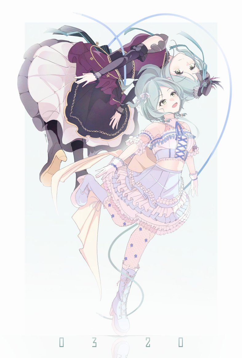 2girls aqua_hair bang_dream! bare_shoulders black_boots black_hat blue_ribbon boots breasts chain corset dated detached_sleeves dress frilled_gloves frilled_skirt frills full_body gloves goth_fashion green_eyes hat heart hikawa_hina hikawa_sayo idol_clothes long_hair long_skirt looking_at_another medium_breasts multiple_girls pantyhose purple_boots purple_ribbon ribbon ryo_yanakasa short_hair siblings simple_background skirt small_breasts star_(symbol) star_print star_print_pantyhose twins white_background white_gloves white_pantyhose white_ribbon