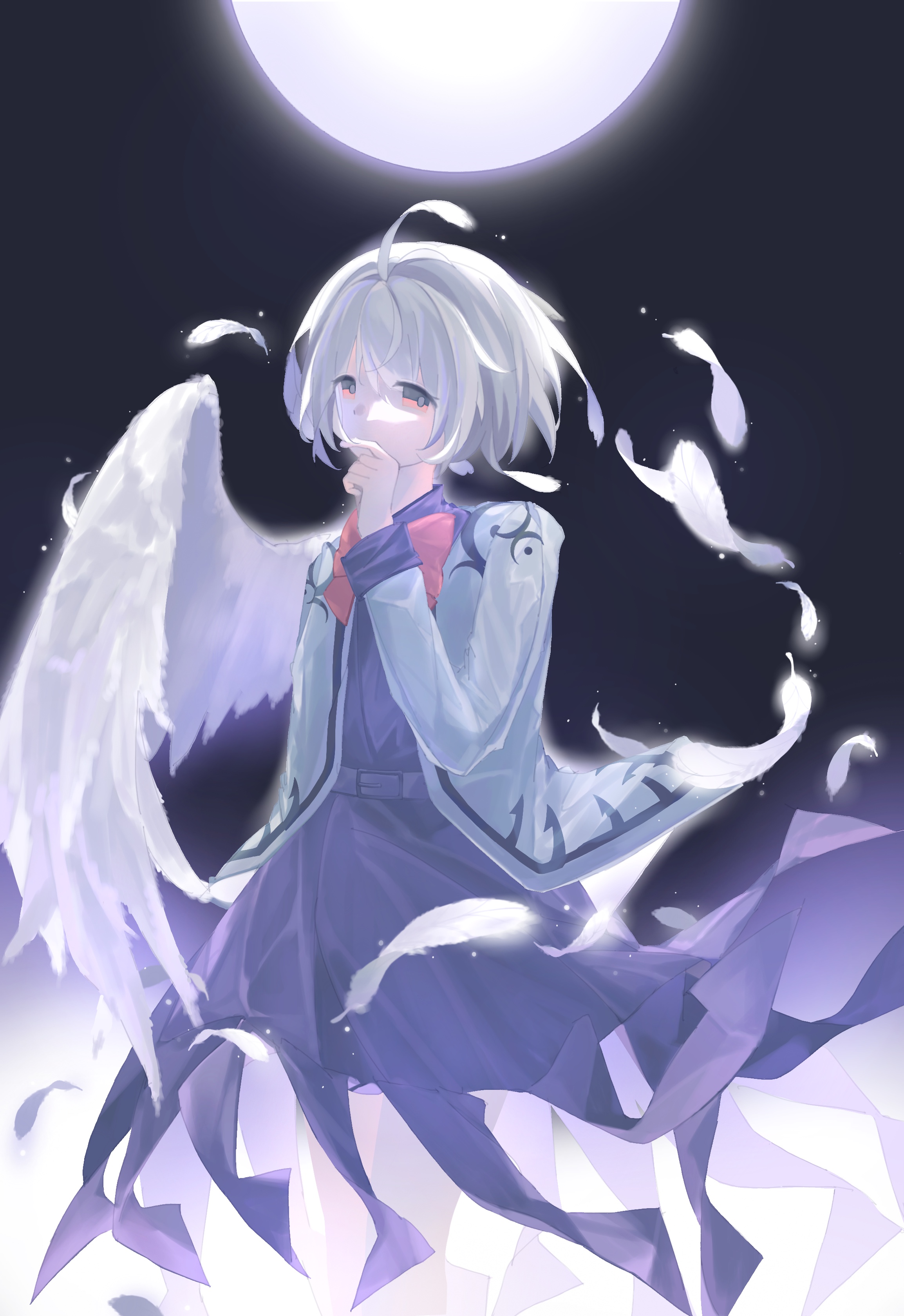 1girl absurdres belt bow bowtie chinese_commentary commentary_request covered_mouth covering_own_mouth dress feathered_wings highres huangqinzi_sayuri jacket kishin_sagume long_sleeves mixed-language_commentary moon original partial_commentary purple_belt purple_dress red_bow red_bowtie short_hair single_wing sleeve_cuffs solo standing touhou white_hair white_jacket white_wings wings