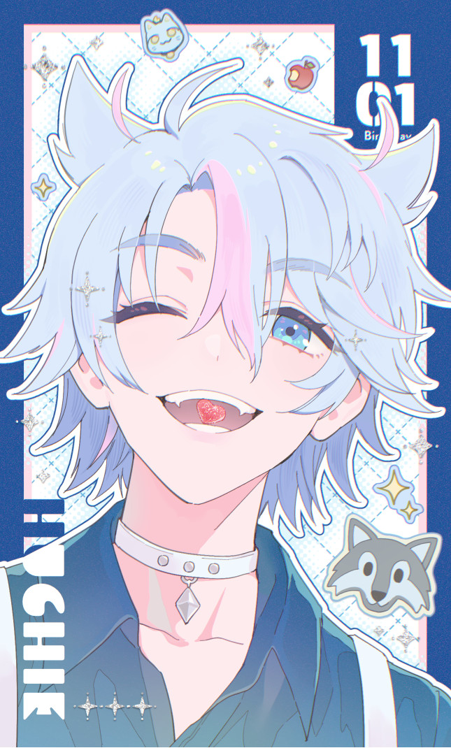 1boy blue_border blue_eyes blue_hair blue_shirt border character_name choker commentary_request hair_between_eyes hair_ears hughie_(pretty_series) looking_at_viewer male_focus multicolored_hair one_eye_closed open_mouth oshiri_(o4ritarou) pink_streaks pretty_series shirt short_hair smile solo streaked_hair upper_body waccha_primagi! white_choker wolf