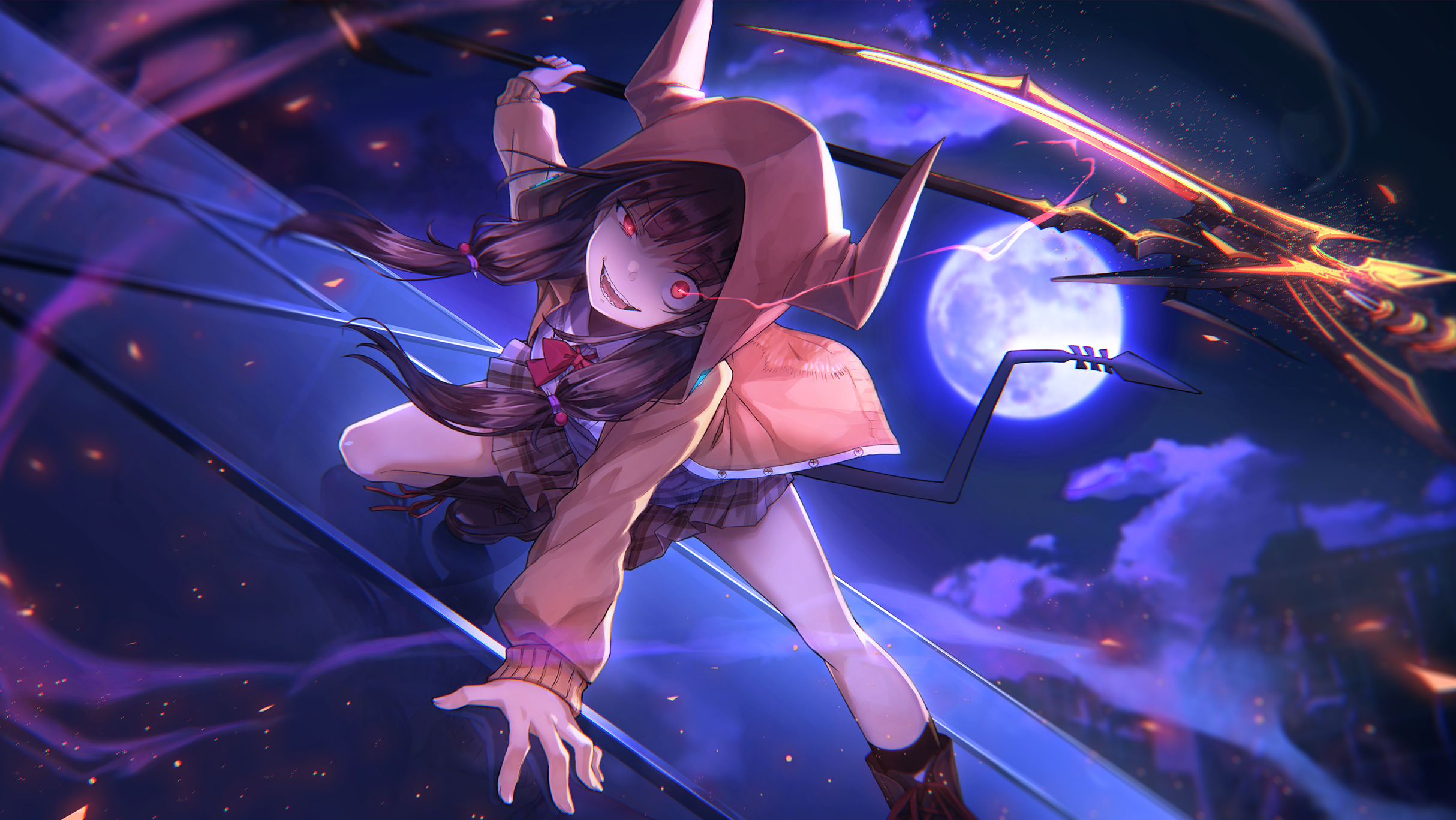 1girl arm_support asakura_karen_(heaven_burns_red) backlighting black_hair blunt_bangs blurry blurry_background boots bow bowtie bright_pupils brown_boots brown_skirt building buttons collared_shirt crazy_eyes crazy_smile dutch_angle fake_horns fighting_stance floating_hair foot_out_of_frame full_moon glowing glowing_eyes glowing_weapon hair_bobbles hair_ornament heaven_burns_red highres holding holding_scythe hood hood_up hoodie horned_hood horns incoming_attack lace-up_boots leaning_forward light_particles long_hair looking_at_viewer low_twintails miniskirt moon moonlight night official_art on_roof open_clothes open_hoodie open_mouth orange_hoodie outdoors plaid_clothes plaid_skirt pleated_skirt red_bow red_bowtie red_eyes scythe shaded_face sharp_teeth shirt skirt sleeves_past_wrists smile solo standing teeth third-party_source tsurime twintails weapon white_pupils white_shirt wide-eyed