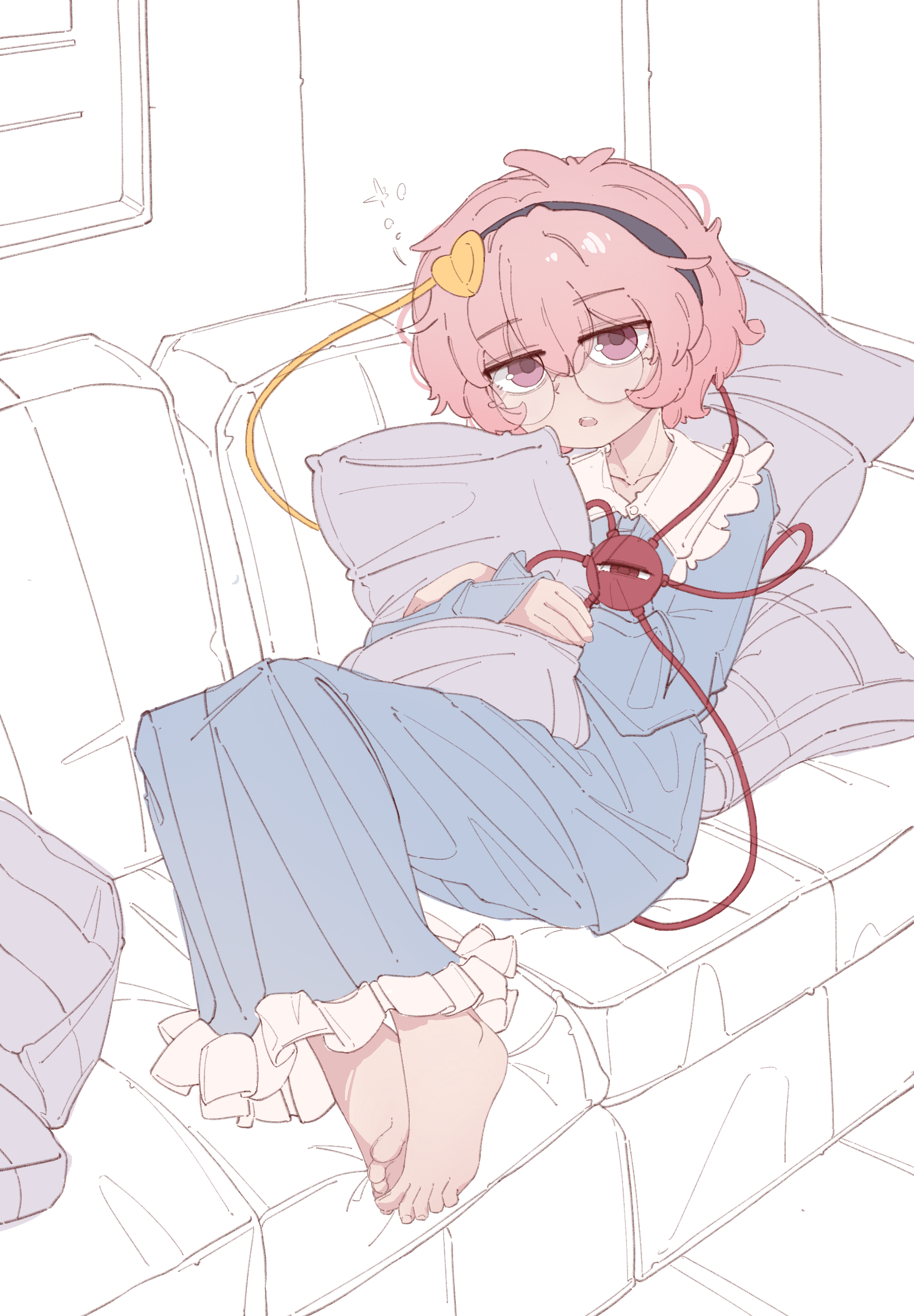 1girl alternate_costume bespectacled black_hairband blue_pants blue_shirt chinese_commentary collared_shirt commentary_request couch eyeball fengzhong_yuntuan frilled_shirt_collar frills glasses hair_ornament hairband heart heart_hair_ornament highres komeiji_satori long_sleeves on_couch open_mouth pants pink_eyes pink_hair round_eyewear shirt short_hair sleepwear solo third_eye touhou