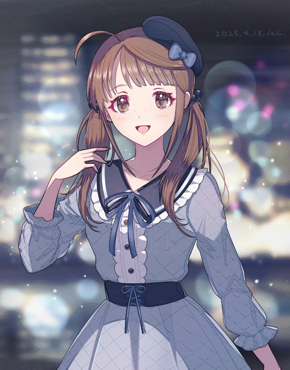 1girl :d ahoge black_hat blurry blurry_background bow brown_eyes brown_hair commentary_request dated dress grey_dress hair_bobbles hair_ornament hand_up hat hat_bow ich. idolmaster idolmaster_cinderella_girls lens_flare night okuyama_saori open_mouth sailor_collar smile solo standing twintails
