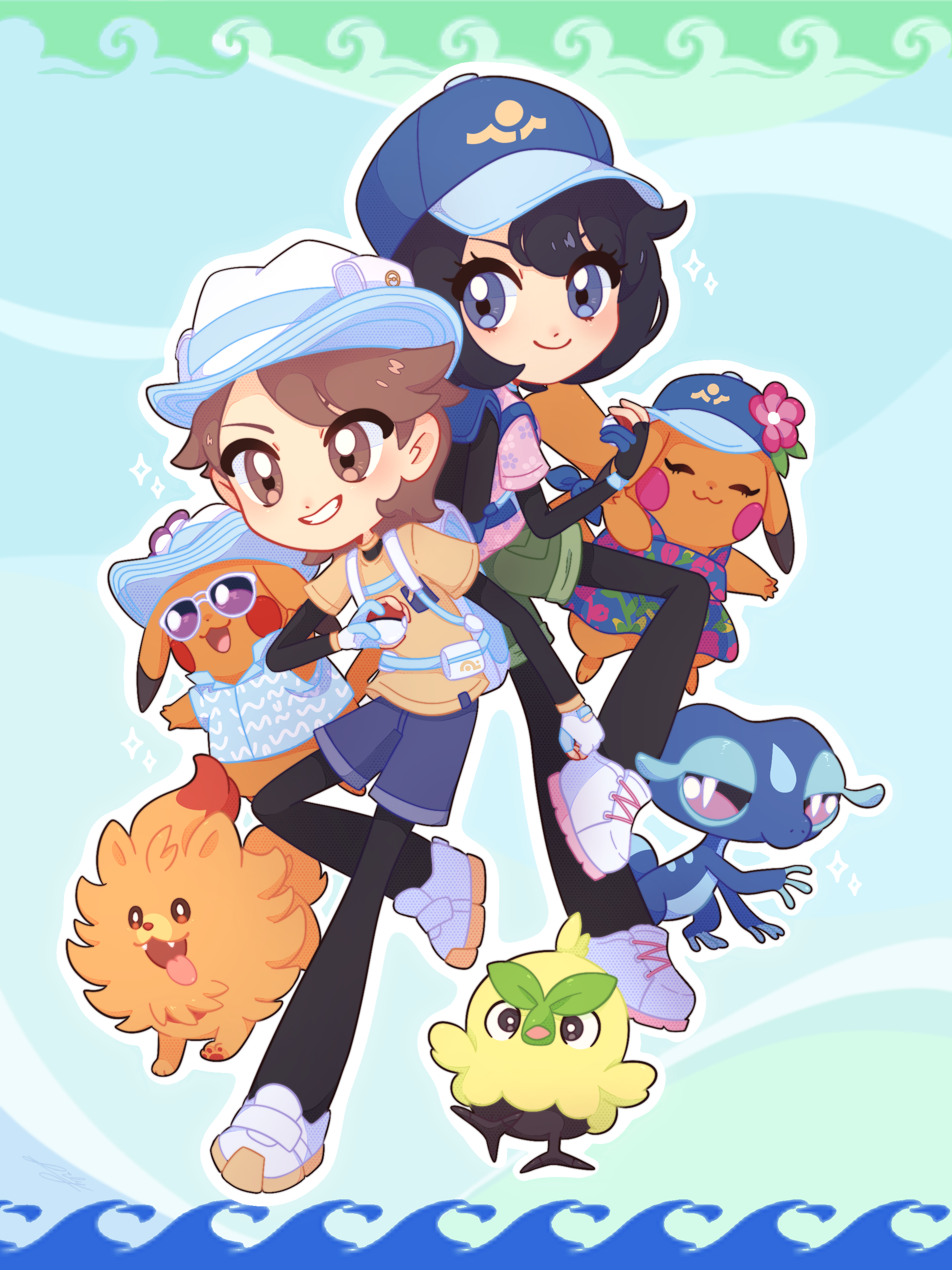 2boys 2girls absurdres baby_animal bird blue_background browt chick female_protagonist_(pokemon_ww) flower gecqua gen_10_pokemon gen_1_pokemon hair_flower hair_ornament highres lizard male_protagonist_(pokemon_ww) mr._windychu ms._wavychu multiple_boys multiple_girls nintendo pikachu pokemon pokemon_(creature) pokemon_winds_and_waves pombon pomeranian_(dog) starter_pokemon_trio unnaturalgingerr waves wind