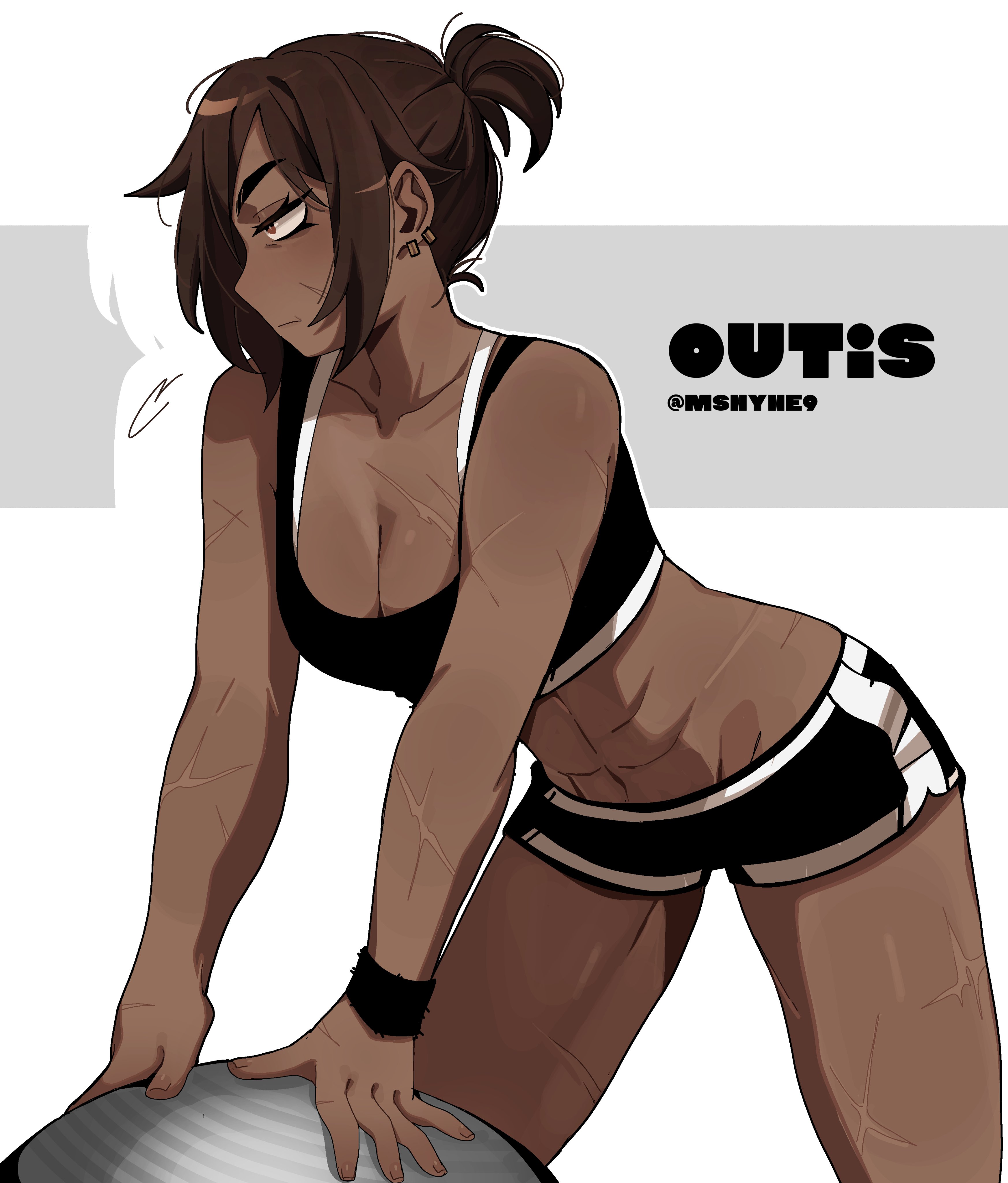 1girl abs absurdres armband ball black_bra black_shorts bra breasts brown_eyes brown_hair character_name colored_skin cowboy_shot dark-skinned_female dark_skin earrings exercise_ball high_ponytail highres jewelry limbus_company looking_to_the_side medium_breasts multiple_scars muscular muscular_female ny_000a outis_(project_moon) ponytail project_moon scar short_hair short_shorts shorts sports_bra sportswear tan twitter_username underwear wrinkled_skin