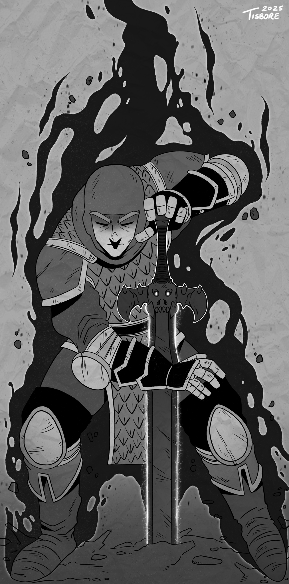 1boy armor artist_name aura boots bracer closed_eyes commentary dated english_commentary facing_viewer full_body gauntlets greyscale highres lemon_(shining_force) male_focus monochrome planted planted_sword planted_weapon shining_(series) shining_force_ii solo standing sword tisbore weapon