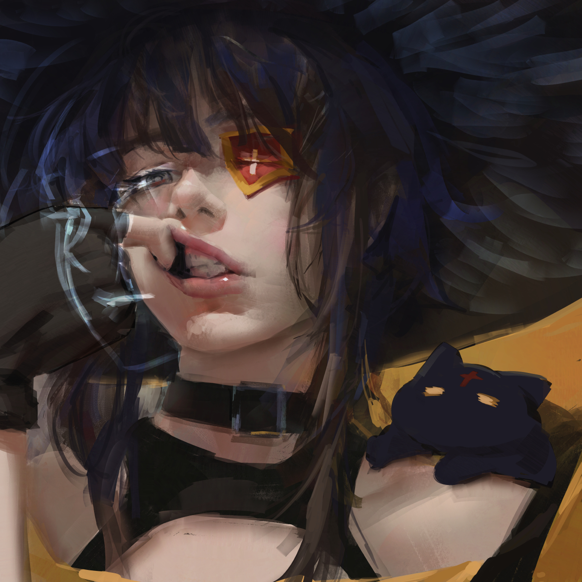 1girl black_choker black_gloves black_hair cat choker chomusuke clenched_teeth commentary dress english_commentary eyepatch fingerless_gloves gloves half-closed_eye hand_up highres kono_subarashii_sekai_ni_shukufuku_wo! lips looking_at_viewer megumin mouth_pull off-shoulder_dress off_shoulder painterly pluvium_grandis portrait short_hair_with_long_locks solo teeth