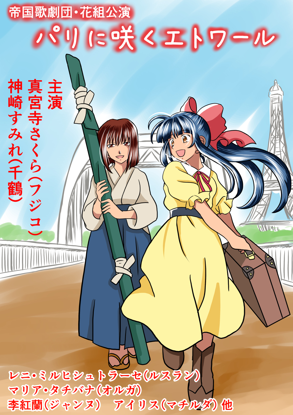 2girls alternate_costume blue_hair boots bow breasts brown_eyes brown_hair hair_ribbon japanese_text kanzaki_sumire legs looking_at_viewer medium_breasts multiple_girls open_mouth ponytail red_bow ribbon sakura_taisen sega shinguuji_sakura short_hair smile sword thighs tongue translation_request weapon