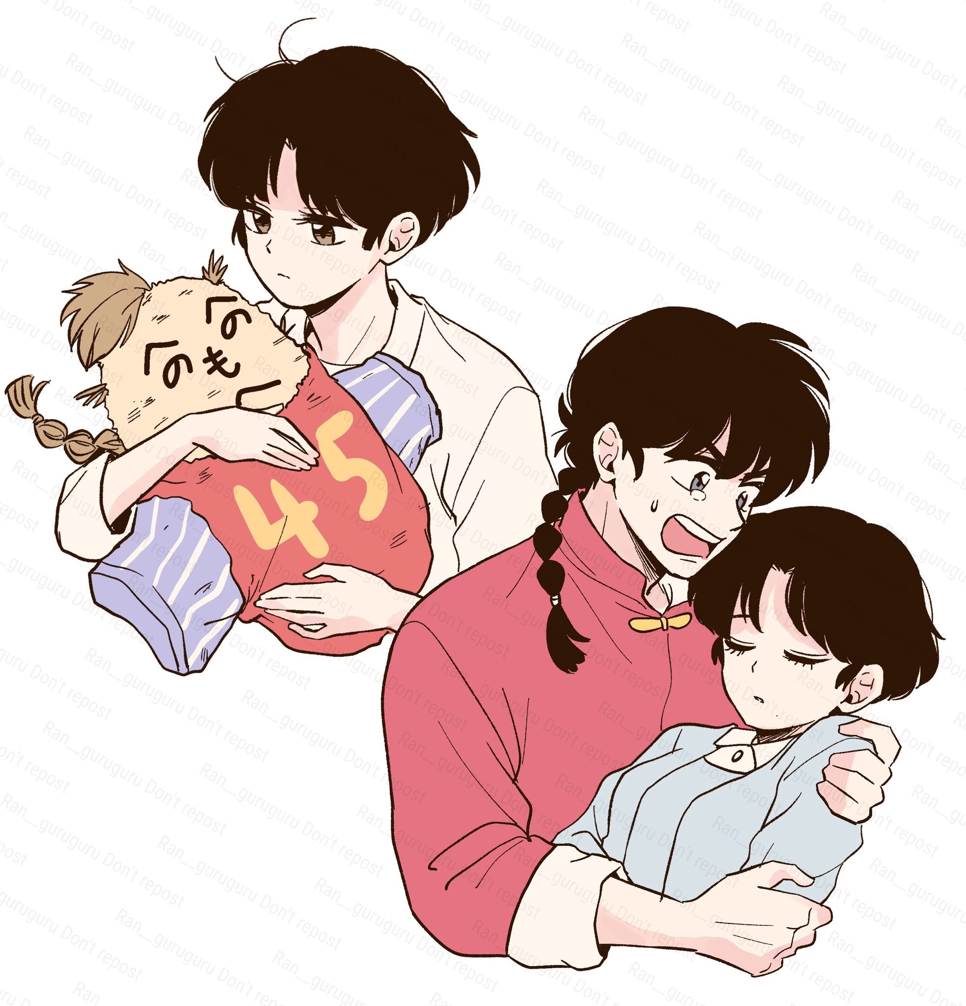 1boy 1girl black_hair brown_eyes chinese_clothes closed_eyes closed_mouth commentary_request dummy grey_eyes highres holding ranma_1/2 saotome_ranma short_hair tearing_up tendou_akane tori_(runrunpiia)