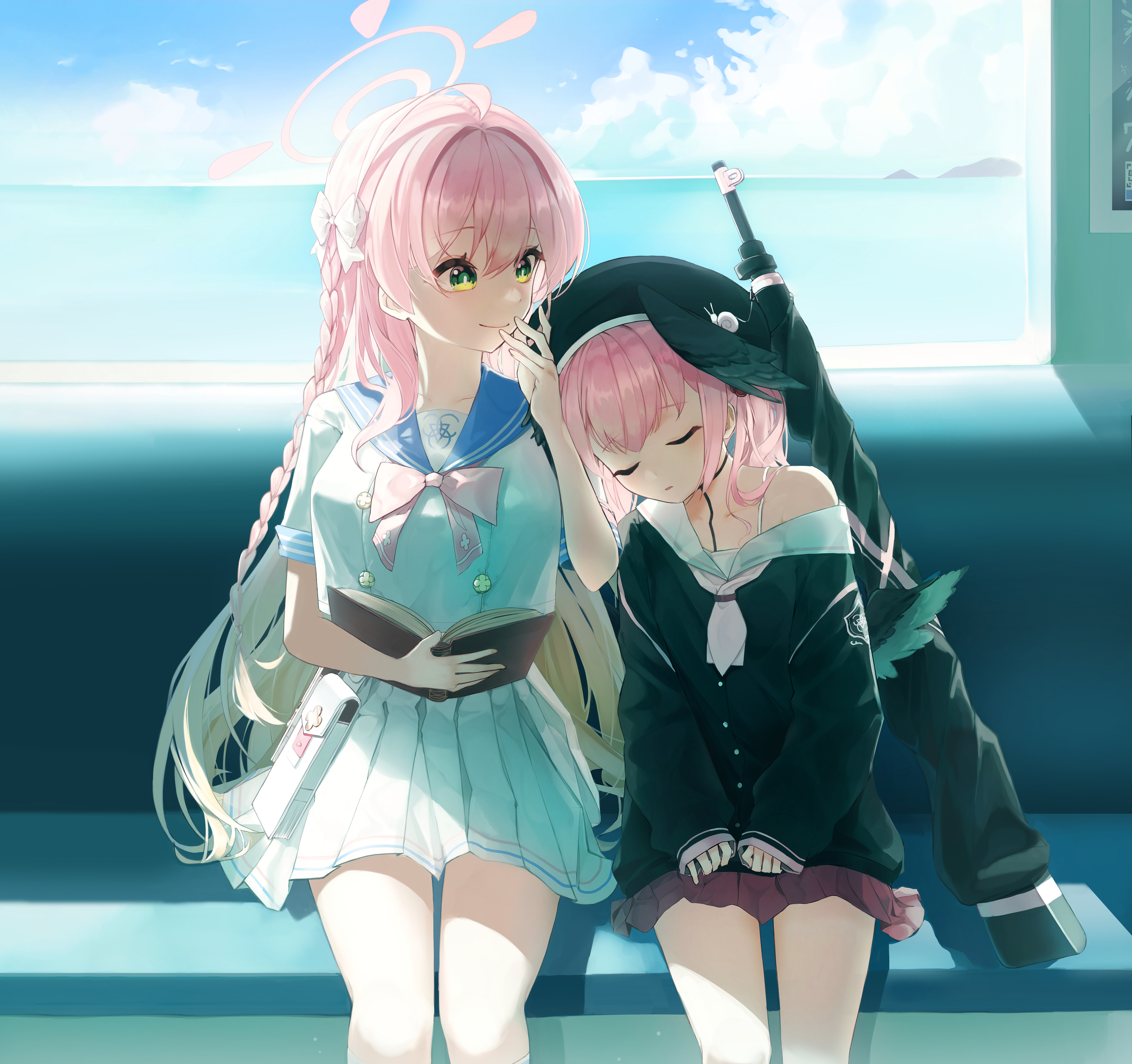 2girls absurdres ahoge bag beret black_bow black_hat black_shoes black_wings blonde_hair blue_archive blue_sailor_collar blurry blush bolt_action book bow bowtie braid breasts charm_(object) collarbone commentary_request crop_top cross crossed_legs double-parted_bangs english_text feathered_wings feet_out_of_frame footwear_bow gradient_hair green_eyes gun gun_sling hair_between_eyes hair_bow halo hanako_(blue_archive) hat head_wings highres holding holding_book kko_nyal koharu_(blue_archive) large_breasts loafers logo long_hair looking_at_another low_twintails medium_hair miniskirt multicolored_hair multicolored_shoes multiple_expressions multiple_girls multiple_views multiple_wings open_mouth p14_enfield pink_bow pink_bowtie pink_eyes pink_hair pink_halo pleated_skirt pouch ribbon rifle sailor_collar school_uniform serafuku shirt shoes short_sleeves side_braid single_braid skirt sleeping sleeve_cuffs solo straight_hair trinity_general_school_logo twintails very_long_hair watson_cross weapon white_bow white_serafuku white_shirt white_skirt winged_hat wings