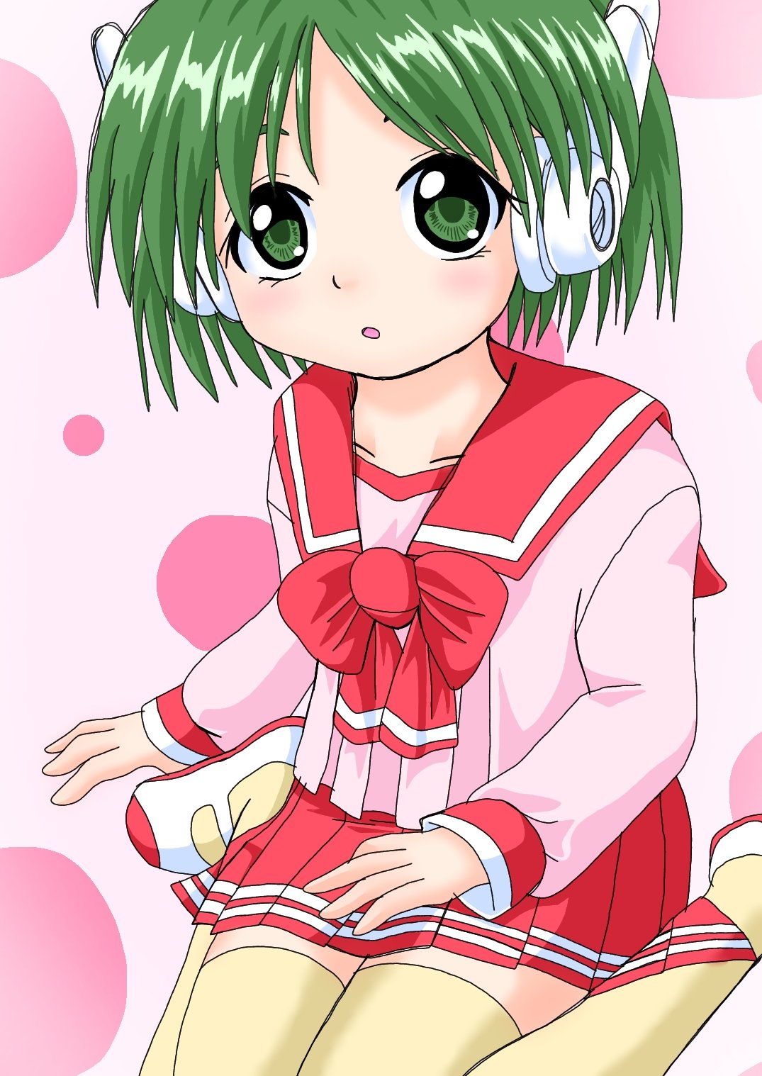 1girl collarbone dot_nose female_focus green_eyes green_hair kawanabe_gurio long_sleeves looking_at_viewer multi_(to_heart) open_mouth red_sailor_collar red_skirt ribbon robot_ears robot_girl sailor_collar school_uniform serafuku shirt shoes short_hair skirt solo thighhighs to_heart to_heart_(series) yellow_thighhighs