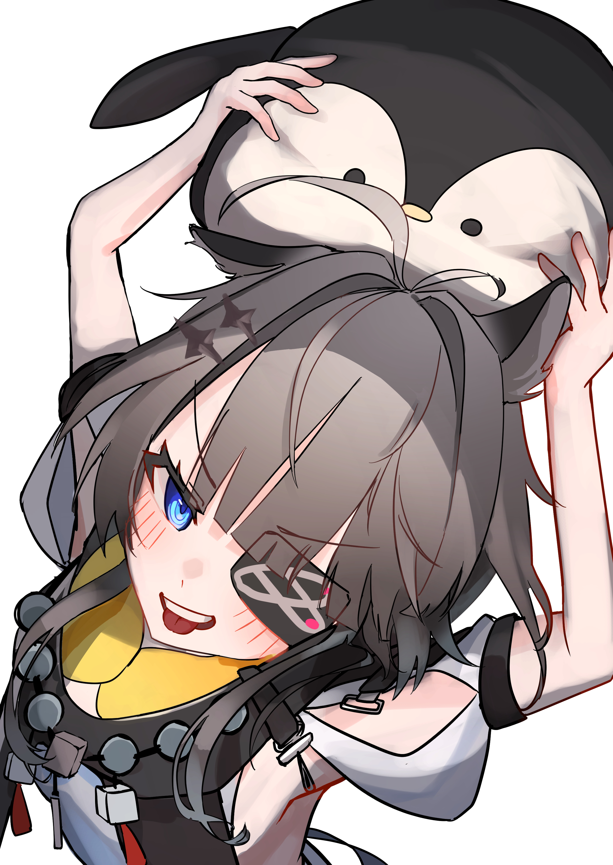 1girl absurdres ahoge animal_ears arknights arknights:_endfield armpit_peek arms_up blue_eyes blush clothing_request commentary_request eyepatch grey_hair hair_ornament hairclip highres holding holding_stuffed_toy medium_hair one_eye_covered rinsyou short_sleeves simple_background solo stuffed_animal stuffed_penguin stuffed_toy stuffed_toy_on_head tangtang_(arknights) teeth tiger_ears tiger_girl tongue tongue_out upper_body upper_teeth_only v-shaped_eyebrows