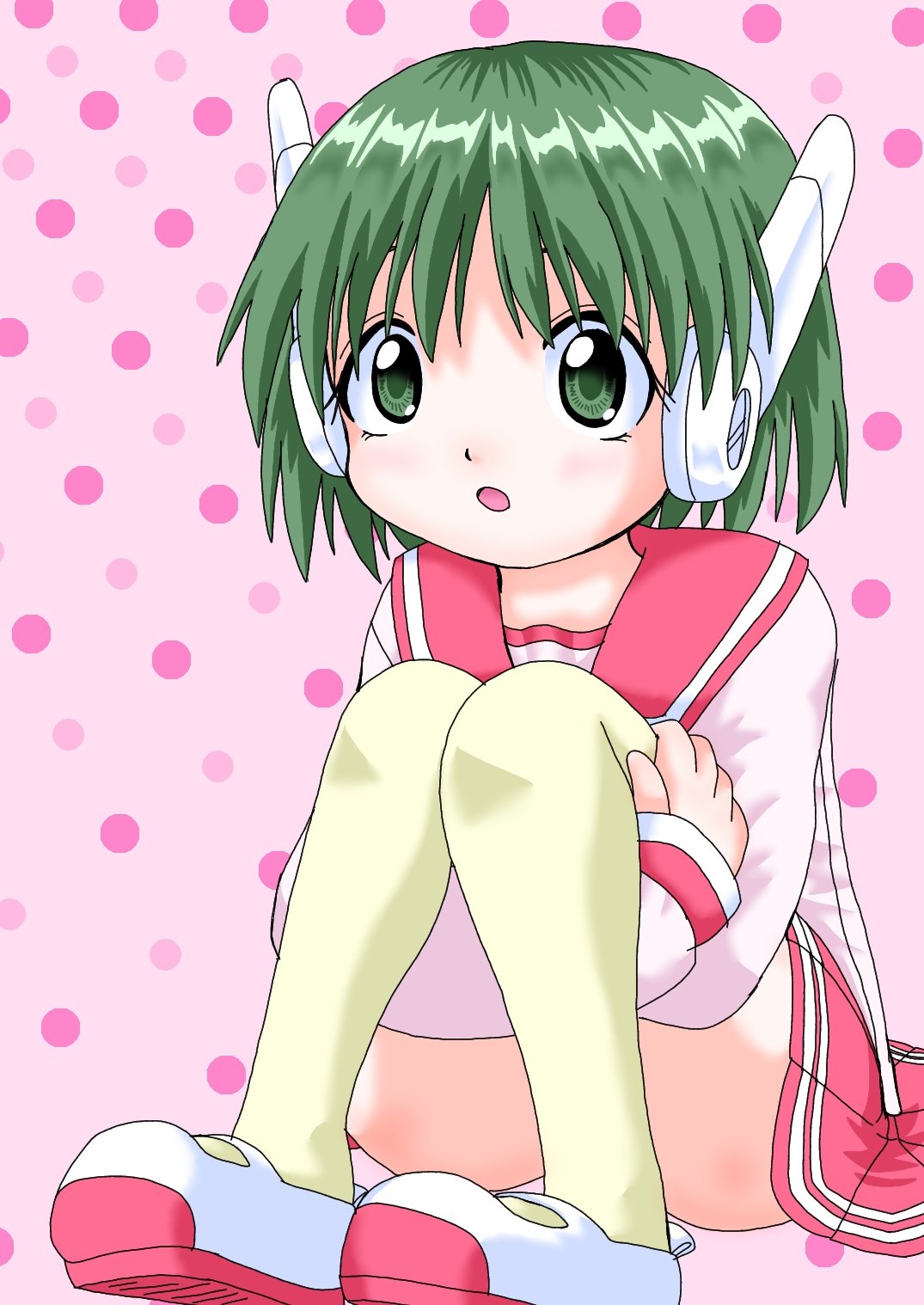 1girl blush convenient_censoring dot_nose female_focus green_eyes green_hair joints kawanabe_gurio legs long_sleeves multi_(to_heart) open_mouth red_sailor_collar robot_ears robot_joints sailor_collar school_uniform serafuku shirt shoes short_hair sitting skirt solo thighhighs thighs to_heart to_heart_(series) yellow_thighhighs