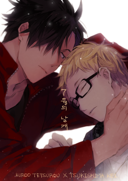 2boys bangoul black-framed_eyewear black_hair black_shirt blonde_hair closed_eyes closed_mouth commentary_request glasses haikyuu!! hair_over_one_eye headphones headphones_around_neck jacket korean_commentary korean_text kuroo_tetsurou looking_at_another male_focus multiple_boys pairing_name rectangular_eyewear red_jacket shirt short_hair simple_background track_jacket tsukishima_kei white_background yaoi