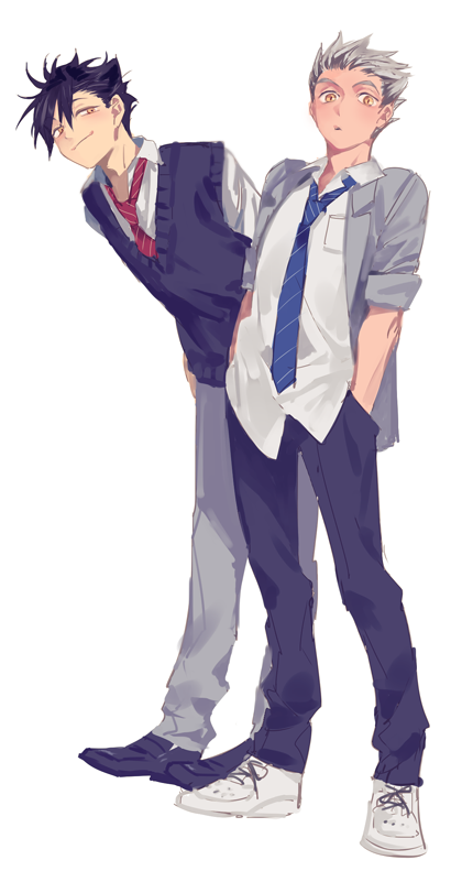 2boys bangoul black_hair black_pants black_shoes black_sweater_vest blue_necktie bokuto_koutarou closed_mouth collared_shirt commentary_request diagonal-striped_clothes diagonal-striped_necktie grey_hair grey_pants haikyuu!! hands_in_pockets jacket korean_commentary kuroo_tetsurou looking_at_viewer male_focus multiple_boys necktie open_clothes open_jacket pants red_necktie shirt shoes short_hair simple_background standing striped_clothes sweater_vest untucked_shirt white_background white_shirt