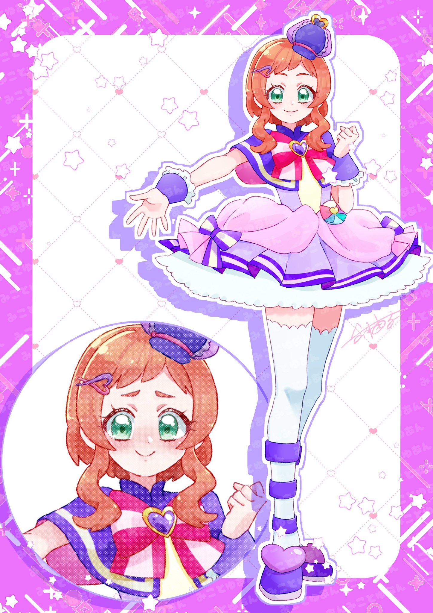 1girl artist_name bow bowtie brooch capelet clenched_hand closed_mouth commentary cosplay cure_friendy cure_friendy_(cosplay) cure_friendy_pose dress dress_bow flat_cap full_body green_eyes hair_ornament hairclip hat heart heart_brooch highres inukai_iroha jewelry looking_at_viewer medium_dress mini_hat outline pact_holder pink_bow pink_bowtie pota0606119 precure purple_background purple_bow purple_capelet purple_dress purple_hat purple_shoes purple_theme reaching reaching_towards_viewer red_hair shoes short_hair short_hair_with_long_locks signature smile solo standing star_(symbol) thighhighs tilted_headwear white_outline white_thighhighs wonderful_precure! wrist_cuffs zoom_layer