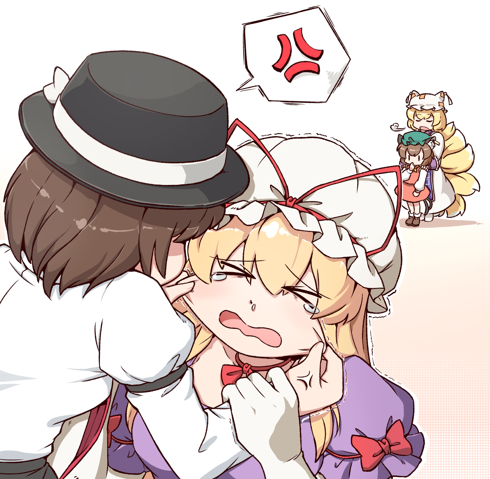 >_< 4girls anger_vein angry animal_ears ankle_boots ankle_socks bilingual_commentary black_hat black_skirt blonde_hair blue_tabard boots brown_boots brown_hair cat_ears cat_tail cheek_pull chen closed_eyes commentary dress ears_under_headwear english_commentary exhaling_smoke fox_girl fox_tail frilled_sleeves frills full_body green_hat hands_on_another's_shoulders hat hat_ribbon highres kitsune korean_commentary kyuubi long_hair long_sleeves medium_hair medium_skirt mirae_somang mixed-language_commentary mob_cap multiple_girls multiple_tails neck_ribbon necktie nekomata open_mouth punishment purple_dress red_necktie red_ribbon red_skirt red_vest ribbon shirt short_sleeves simple_background skirt skirt_set snot socks spoken_anger_vein standing tabard tail tearing_up top_hat touhou usami_renko vest white_background white_dress white_hat white_ribbon white_shirt yakumo_ran yakumo_yukari |_|